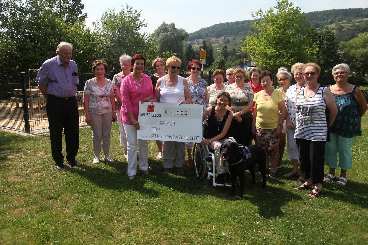 Bei herrlichem Sommerwetter überreichten kürzlich die 'Fraen an Mammen Bettendorf' einen Scheck an RAHNA 'Muppen ënnerstëtze Leit am Rollstull'. Die Summe von 4000€ kam bei der 'Kaffisstuff' am 1. Adventssontag in Bettendorf zusammen. Im beisein zahlreicher Damen und des Bürgemeisters Albert Back bedankte sich Tessy Wies für die grosszügige Spende und gab Erklärungen über den ehrenamtlichen Verein Rahna, ihr Assistenzhund Faustine zeigte den Interessierten dann wie er seinem Frauchen im Alltag zur Seite steht. Der Nachmittag endetet mit einem grossartigen Kuchenbuffet im schönen Chalet nahe der Sauer. www.rahna.lu