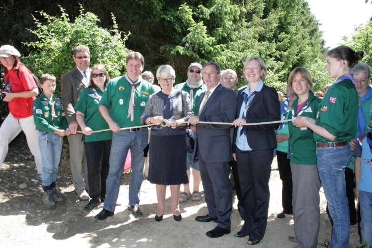 1981 sei alsdann am oberen Teil des Campingfeldes das Chalet errichtet worden, das nun nach umfangreichen Umbauarbeiten ebenfalls den neuesten Sicherheitsbestimmungen gerecht werde. Im Rahmen der feierlichen Zeremonie oblag es Penelope Cooper anschließend, einen Gedenkstein zu enthüllen, bevor die WAGGGS-Fahne gehisst wurde.