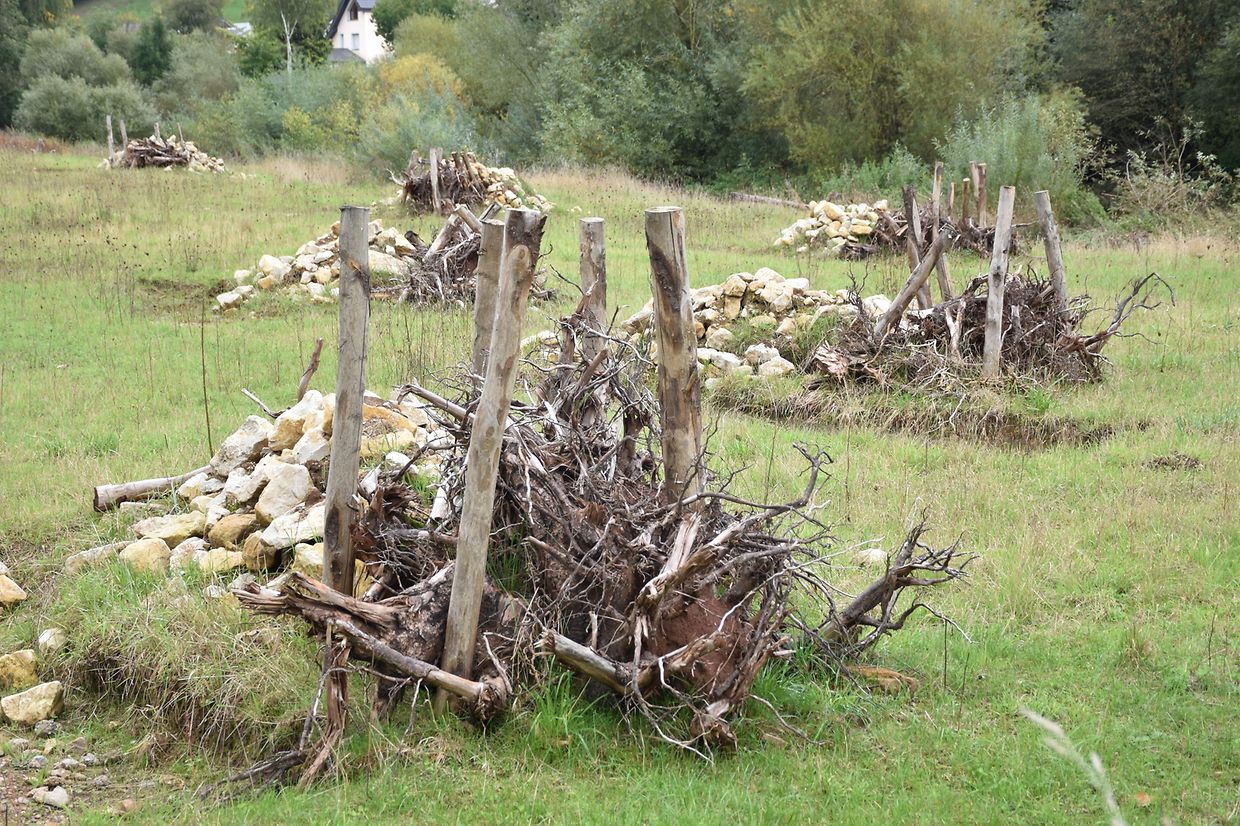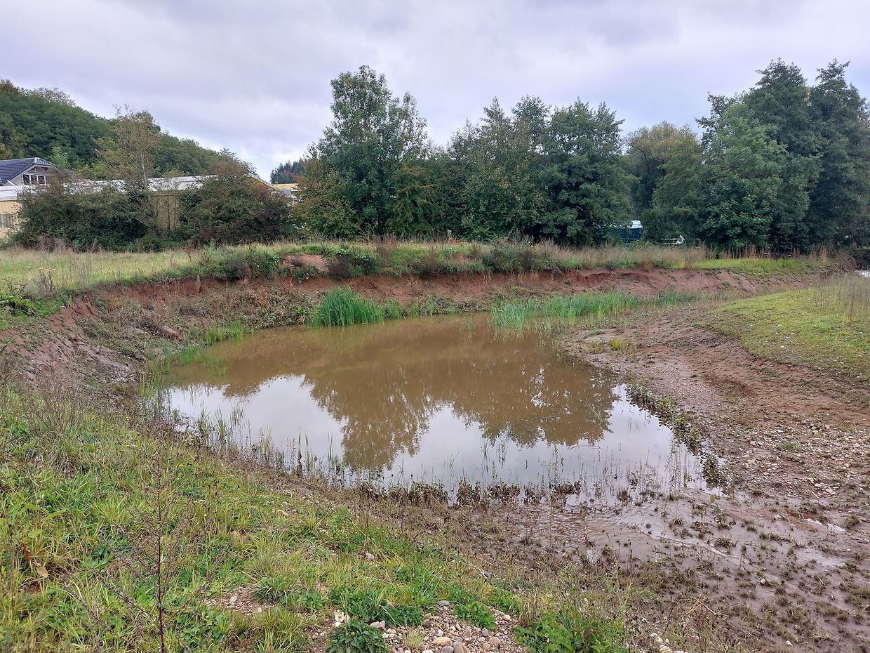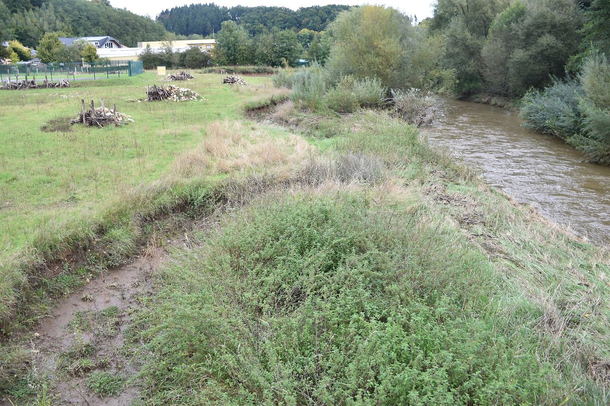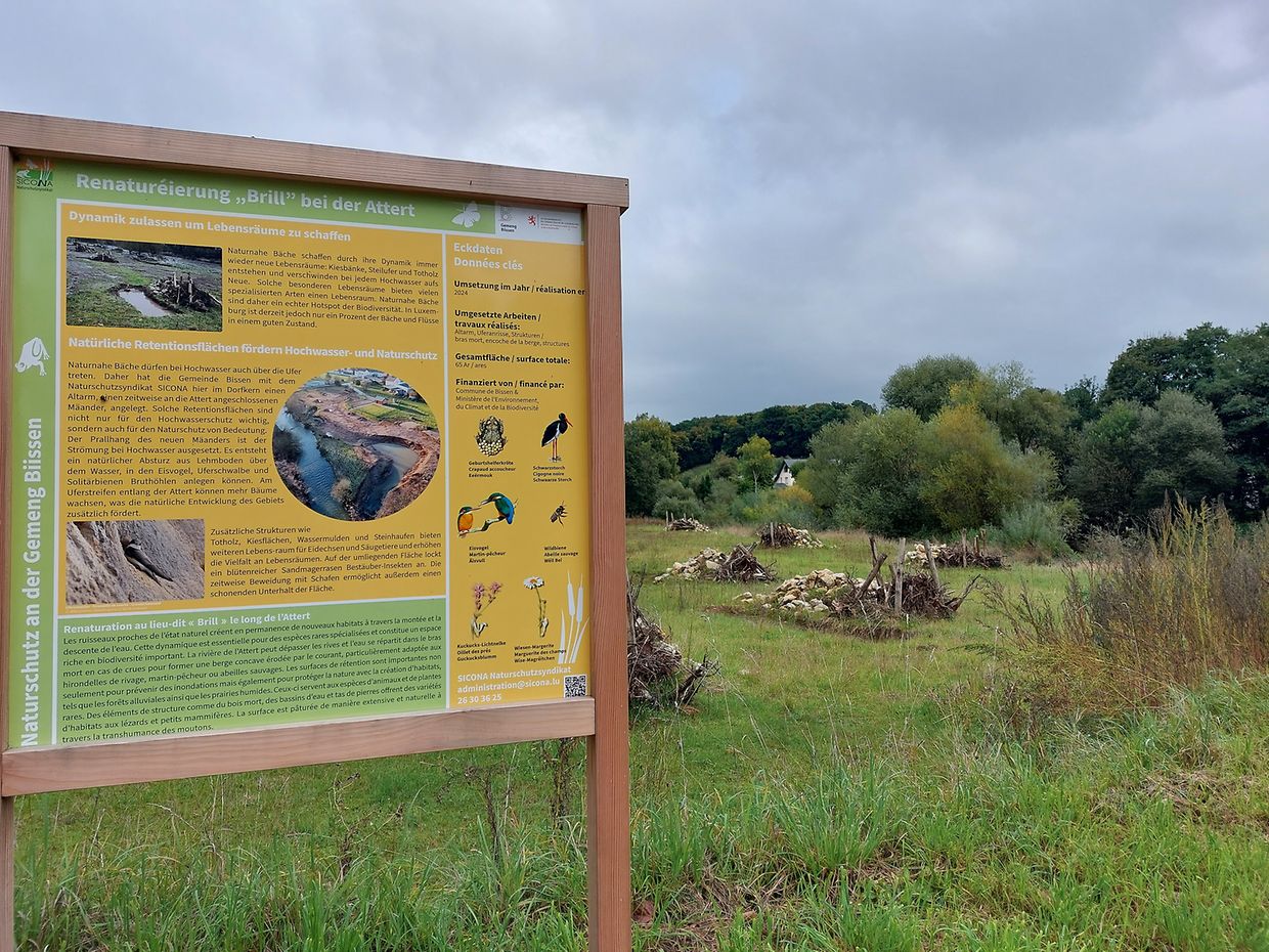 Dans ce contexte, la commune de Bissen a renaturé, en collaboration avec le syndicat pour la conservation de la nature SICONA, une zone riveraine de 65 ares le long de l'Attert. Au centre du village, un ancien bras, un méandre temporairement relié à l'Attert, a été aménagé. Ces zones de rétention sont importantes pour la protection contre les inondations et la conservation de la nature. Comme la berge en amont du nouveau méandre est exposée au courant lors des crues, un déversoir naturel en terre glaise se forme au-dessus de l'eau, dans lequel les martins-pêcheurs, les hirondelles de rivage et les abeilles solitaires peuvent creuser des cavités pour y pondre leurs œufs. De plus, les arbres peuvent pousser sur la bande riveraine le long de l'Attert, ce qui favorise le développement naturel de la zone.