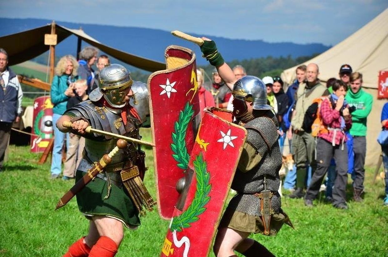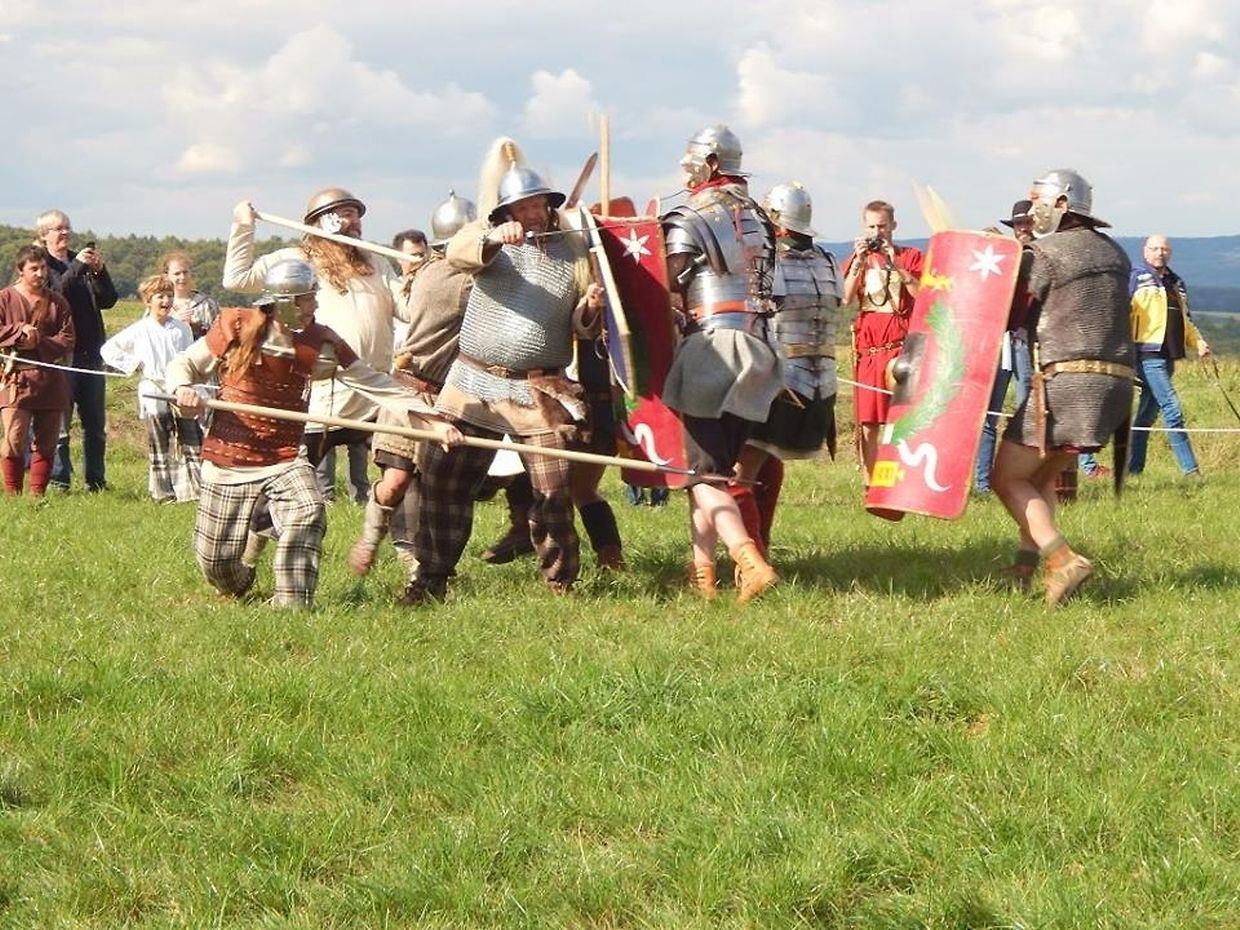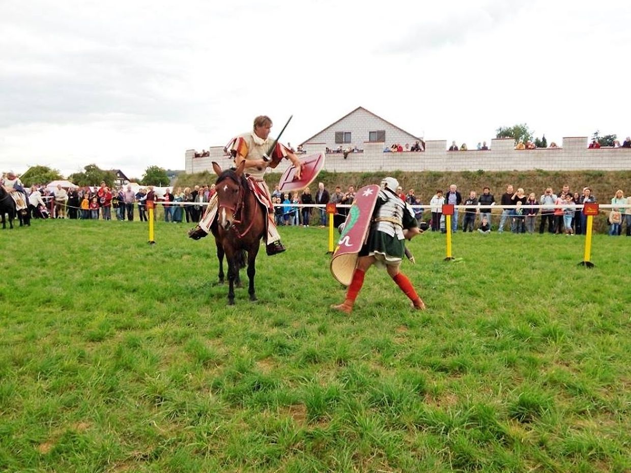 Zwei mal am Tag hielten wir eine Vorführung zur römischen Reiterei zusammen mit Hermann Klinkhammer (Reiter Roms Rapax) ab bei welcher wir als Fusstrupp eine Kampflinie bildeten durch welche das Pferd hindurchbrach. Kampfesweisen vom Pferd aus wurden ebenfalls erklärt und gezeigt. Des weiteren führten wir Trainingskämpfe mit dem Rudis (Holzschwert) wie auch richtige Kämpfe gegen die anwesenden Kelten und Germanen vor.
