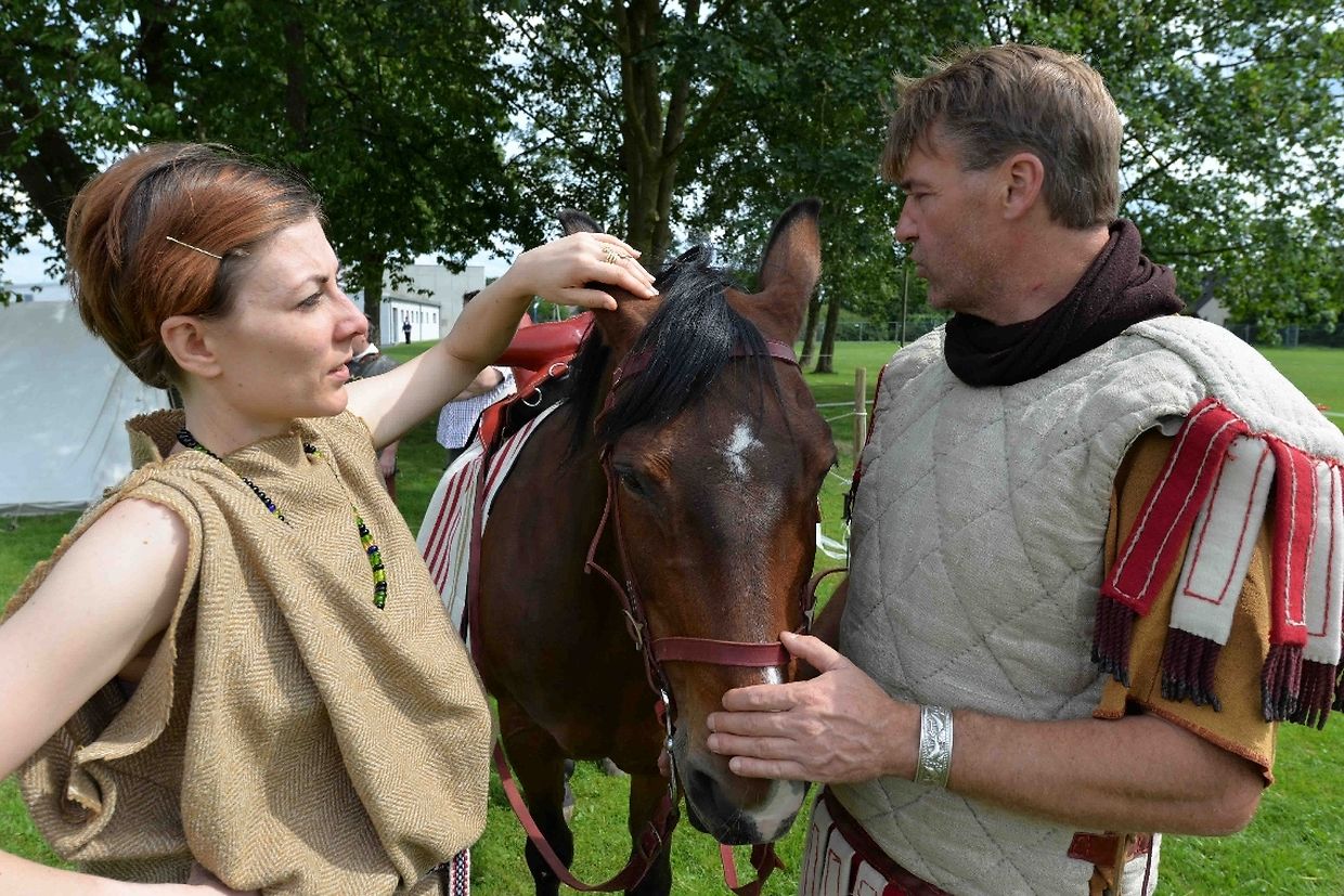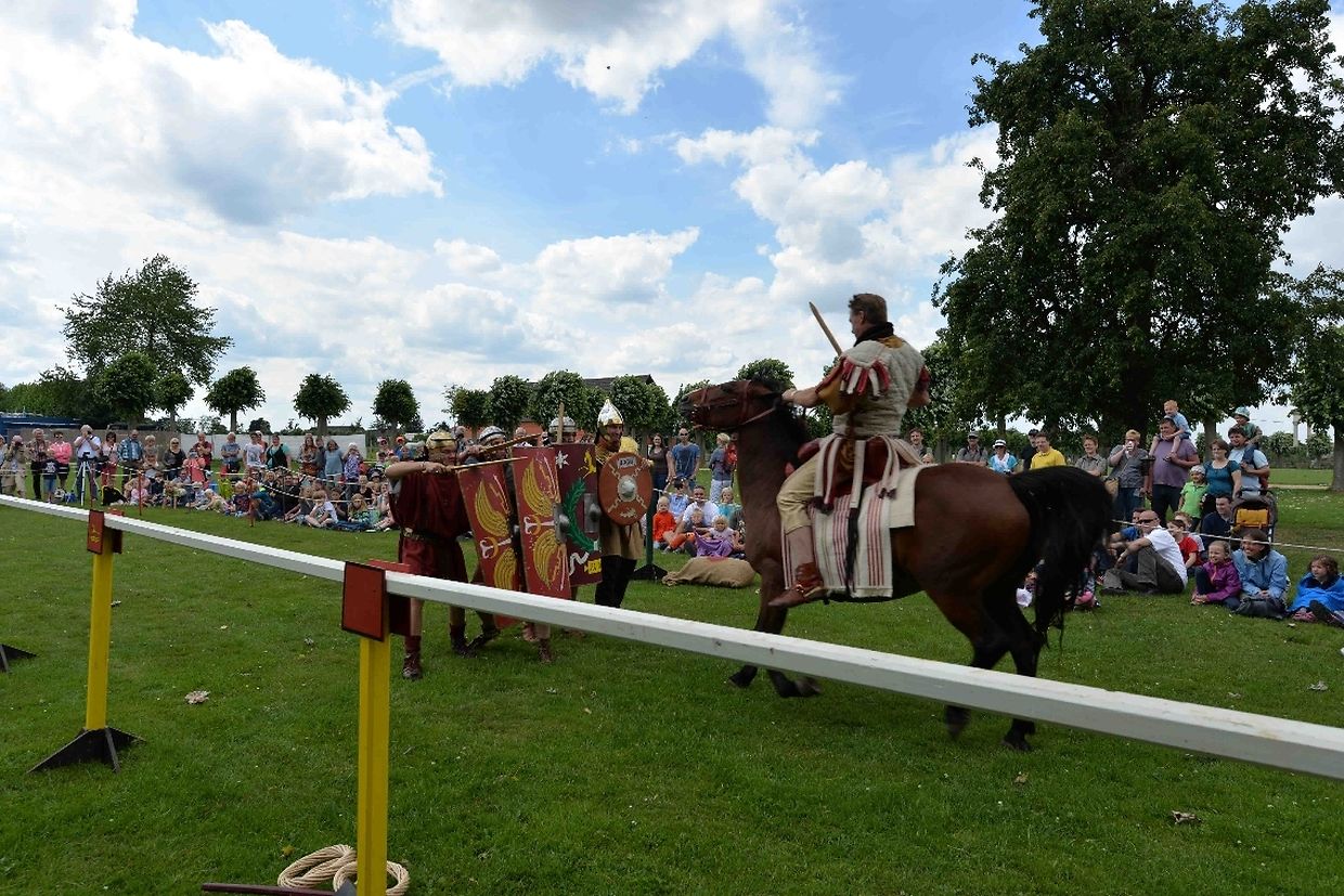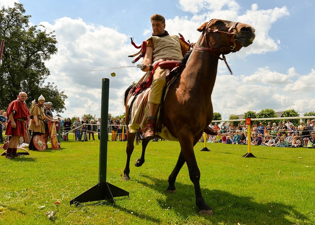 Am Sonntag war das Wetter gut und wir konnten unsere geplante Vorführung durchführen. Dazu gehörte eine einzigartige Reitershow bei welcher gezeigt wurde wie ein Fluchttier wie das Pferd so trainiert wurde dass es selbst durch feindliche Linien durchbrechen konnte. Dabei kannten bereits die Römer eine gewaltfreie Erziehung der Pferde und bauten auf das Vertrauen der Tiere. Zusätzliche Disziplinen waren der Kampf vom Pferd, das Zerschneiden von Früchten im Galopp, sowie das Werfen von Lanzen.