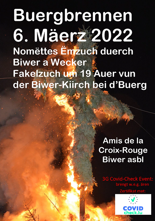 D'Amis de la Croix-Rouge Biwer a.s.b.l. invitéieren ob hiert traditionelt Buergbrennen den kommende Sonndeg 6 Mäerz 2022. Aus gegebenen Anlass verzichte mir dest Joer ob d'Freedefeier. De Fakelzuch start ëm 19:00 Auer bei der Biwer Kiirch. géint 19:30 gett d'Buerg ugefangen. Jiddereen ass haerzlech wellkomm. Et ass een 3G Covid-Check Event. Brengt w.e.g. ären Zertifikat mat.