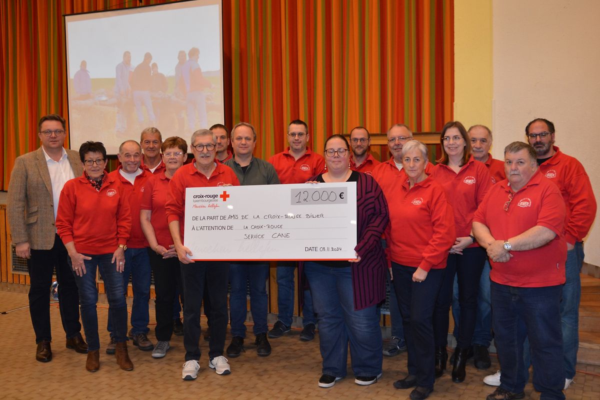 An all deene Jore koum déi flott Zomm vu méi ewéi 150.000 € zesummen, déi de verschiddenen Organisatiounen ewéi d’Canne Blanche, dem Institut St. Joseph vu Betzdorf, dem Kannerland, Foyer Pietert, Kannerduerf Miersch, Soins à domicile Waasserbëlleg, Sclérose en Plaque, Altersheem ob Lamp, …… oder méi rezent den Iles aux Clown resp. der Fondatioun Wonschstär, fir gezielte Projeeën zur Verfügung gestallt goufen. Reegelméisseg war awer och an där Zäit d’Lëtzebuerger Rout-Kräiz eraus gewielt gi fir Projeeën ze ënnerstëtzen. Bei Geleeënheet vun dëser Feierstonn, hu mir dem Lëtzebuerger Roude Kräiz a Präsenz vun der Madame Mireille Neuen, responsabel Direktesch fir Kanner & Familljen-Hëllef an dem Här Tom Biever, Responsabel vum Centre d’Accueil Norbert Ensch e Scheck an der Héicht vun 12.000 Euro fir de Projet « CANE » iwwerreecht.
