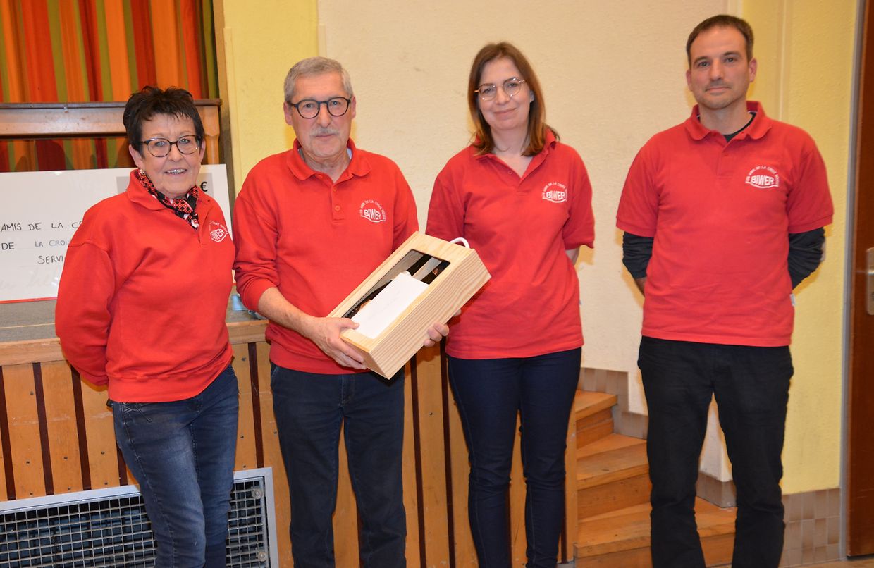 Dem Romain Nies, jëtzege President vun den Amis de la Croix-Rouge a Grënnungsmember, gouf fir seng 50 järeg Aktivitéiten am Veräin an am Komitee Merci gesot an e klenge Kaddo iwwerreecht.