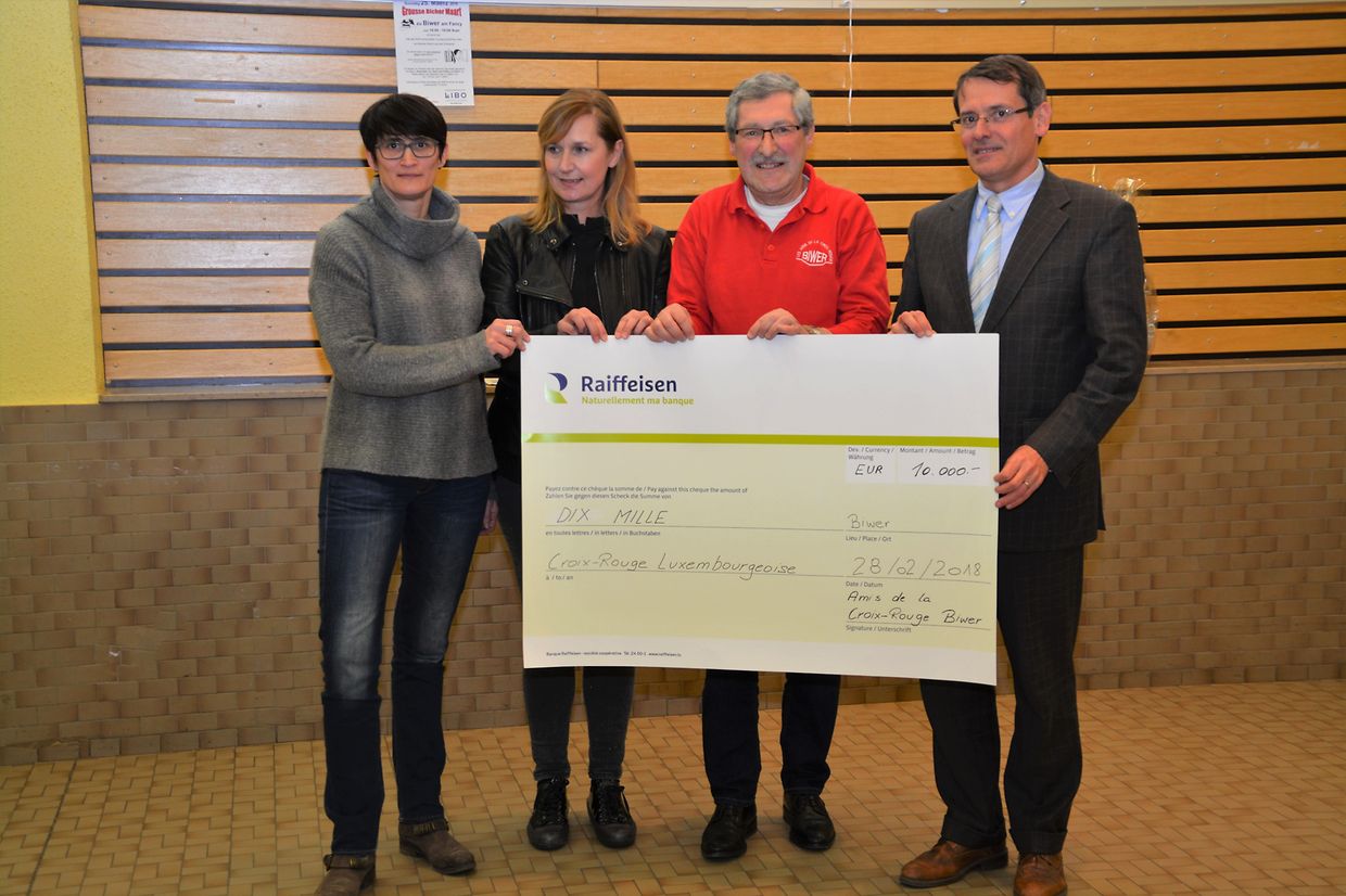 Bei Geleeënheet vun enger klenger Feierstonn an a Präsenz vum Här Michel Simonis, Directeur Général vum Lëtzebuerger Roude Kräiz, der Madame Sylvie Steinmetz an dem Här Marc Greis vum Schäfferot vun der Gemeng Biwer an verschiddenen Vertrieder vum Gemengerot an Matarbechter vum Roude Kräiz, haten d’Amis de la Croix-Rouge Biwer den groussen Pleséier een Scheck vun 10.000 EUR dem Service “Perspectives Logements encadrés” vum Lëtzebuerger Roude-Kräiz ze iwwerreechen.