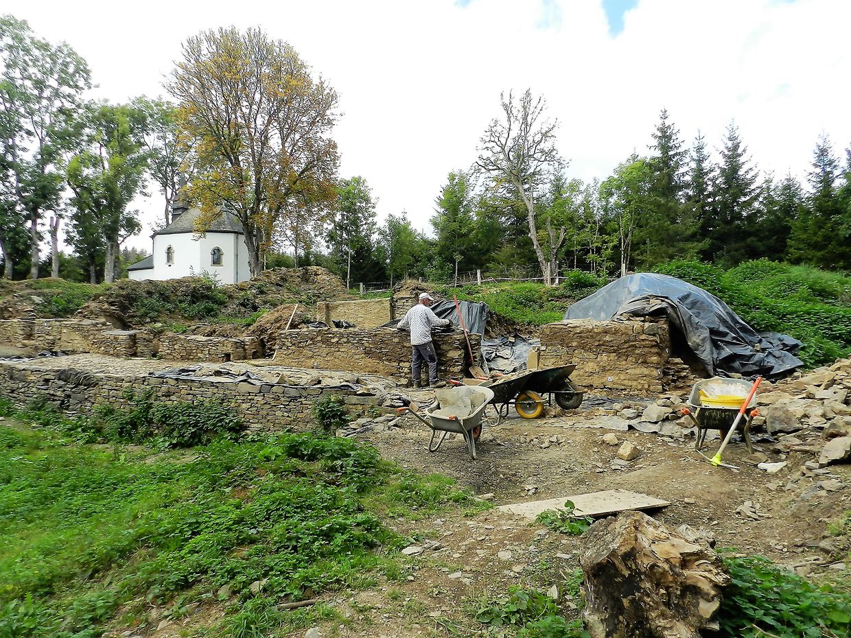 Bis virun zwee Joer....dunn hunn , Les Amis de St. Pirmin vun Kaunerëf, d' Natur an Ëmweltverwaltung matt der Hëllef vum CNRA an villen fleissigen Hänn, ugefong, lues an lues, d' Konturen vum Përmeshaff erëm un Dagesliicht ze bréngen. Bis elo sin ërem 54 m vun de Maueren erausgebuddelt an mat der Hëllef vum Kulturministère befestigt ginn.