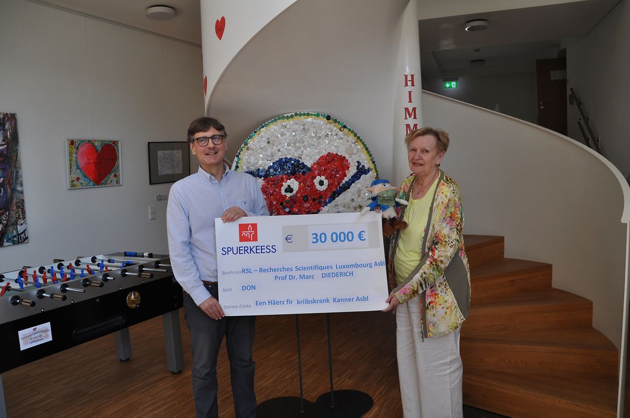 Dans les statuts de notre asbl « Een Häerz fir kriibskrank Kanner » nous mettons en évidence notre dévouement au « soutien à la recherche contre le cancer ». Nous soutenons la recherche contre le cancer de l’enfant et de l’adolescent depuis le 24 février 2000. Lors de l’Assemblée Générale de notre Asbl du 26 mars 2018, il a été décidé d’accorder dorénavant 10% des dons reçus aux projets de recherche du Prof. Dr. Marc DIEDERICH, Directeur du Laboratoire de Biologie Moléculaire et Cellulaire du Cancer (LBMCC).