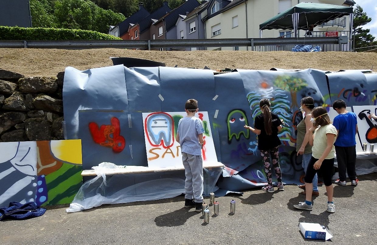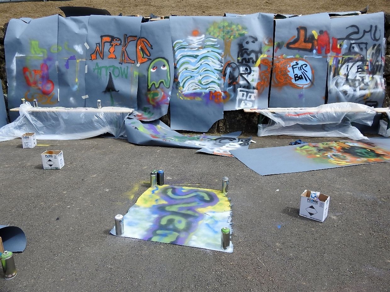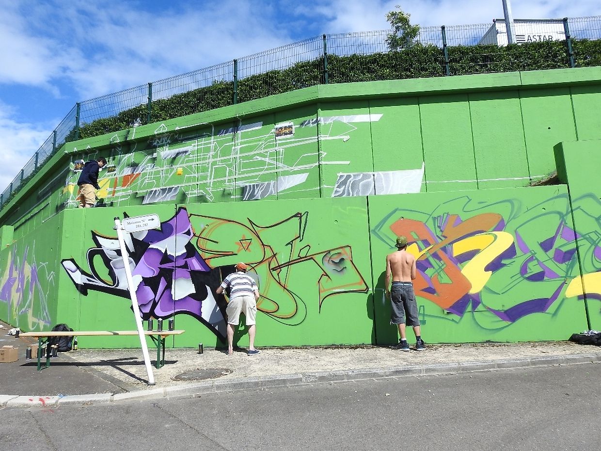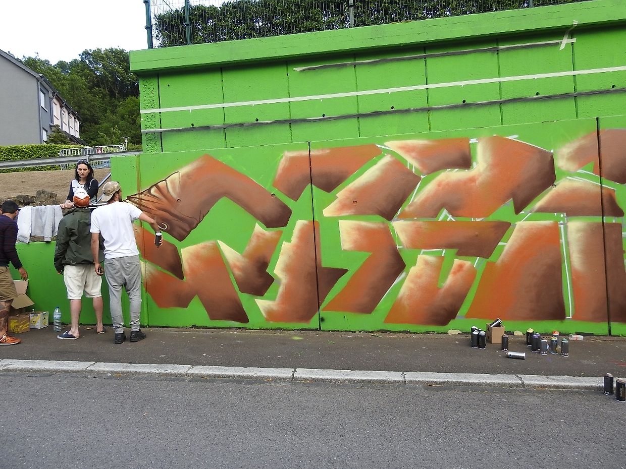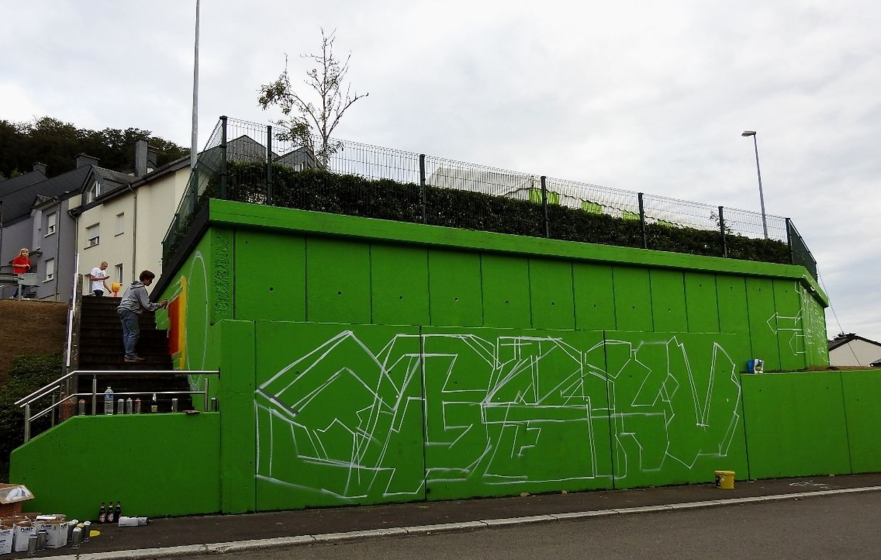 Während dem ganzen Weekend konnte een deenen verschiddenen Artisten bei hirer Aarbecht iwwer d´Schëller kucken an wien drun interesséiert war konnt selwer e Graffiti Panneau sprayen.