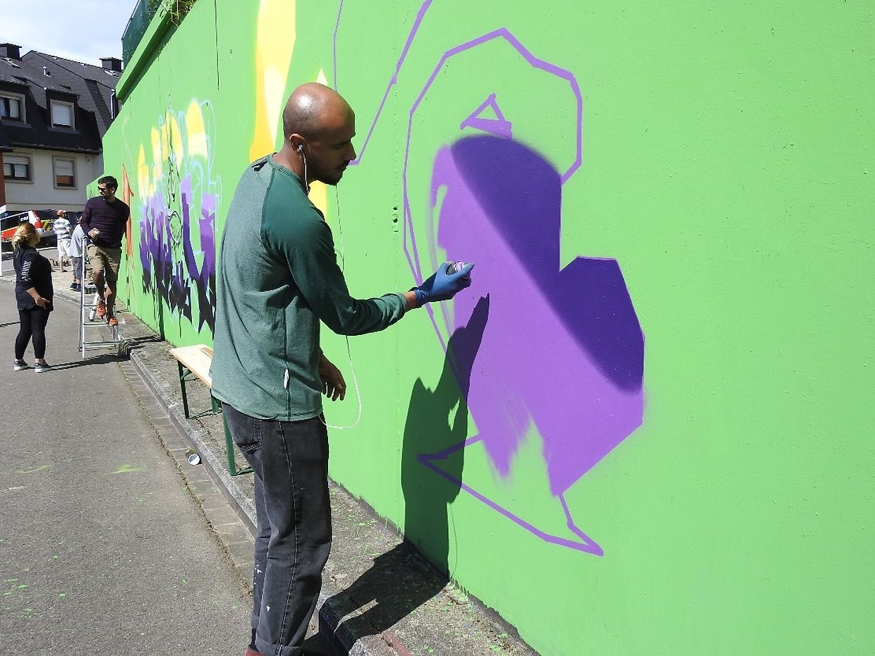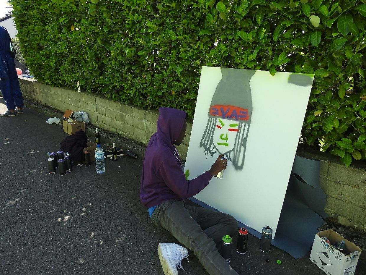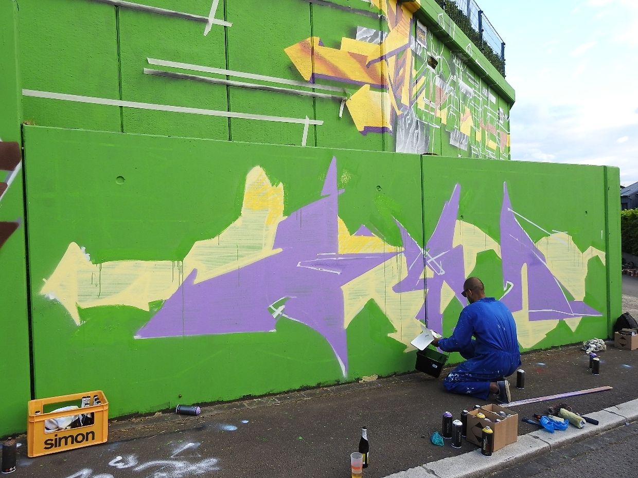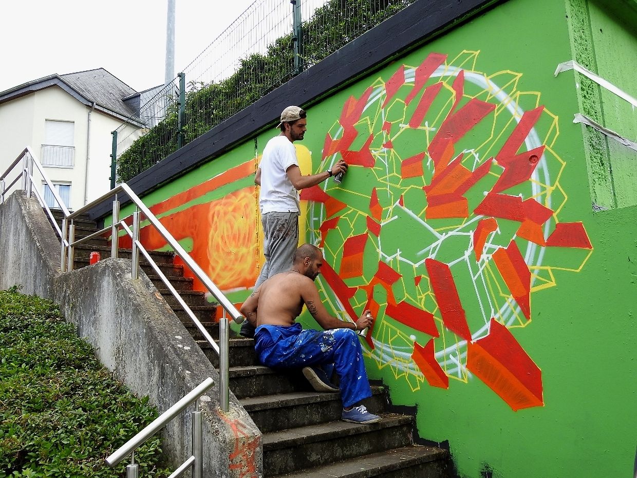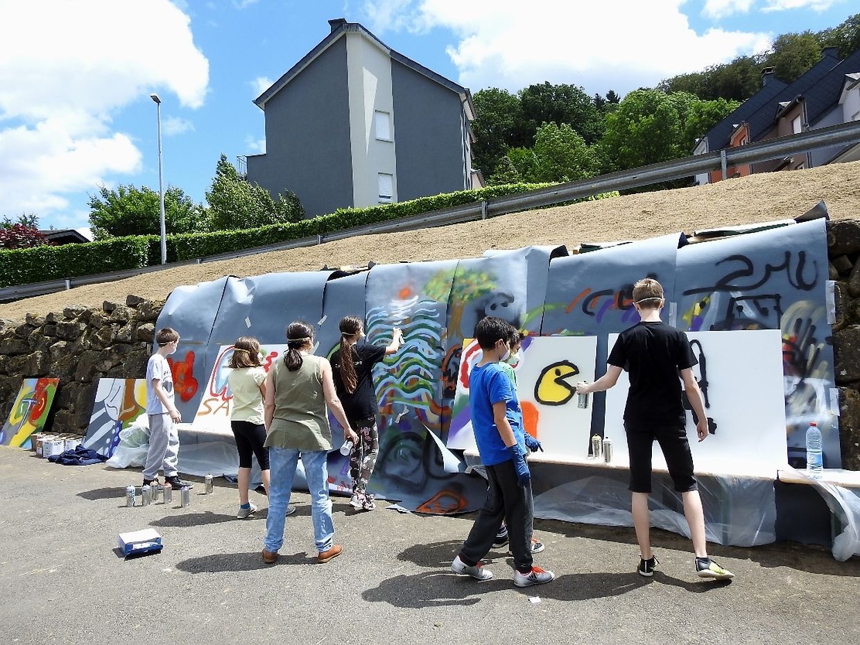 Während dem ganzen Weekend konnte een deenen verschiddenen Artisten bei hirer Aarbecht iwwer d´Schëller kucken an wien drun interesséiert war konnt selwer e Graffiti Panneau sprayen.