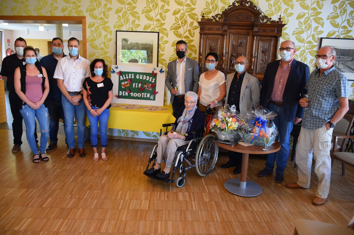 Ob den Dag selwer vum hirem 100. Gebuertsdag hunn eis Familljeministesch Corinne Cahen, an de Schäfferot vun der Gemeng Bäertref, zesumme mat der Famill an dem Personal vum Pflegeheem dem Fina hir Gléckwënsch iwwerbruecht. Am Numm vun eisem Grand-Duc Henri krut sie de “Ordre de mérite du Grand-Duché de Luxembourg” iwwerreecht.