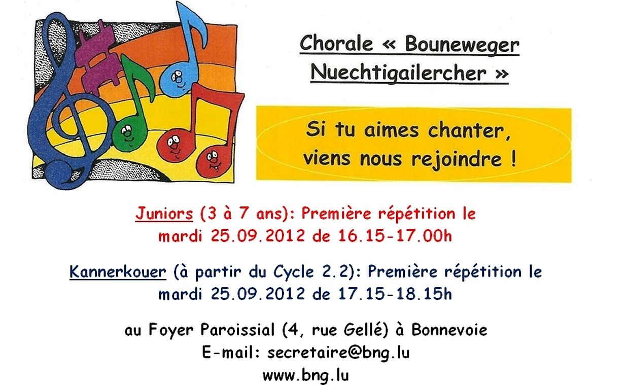 Luxemburg - Bonneweg (Billergalerie) Familijemass zu Bouneweg Bouneweger Nuechtigailercher 5 Bildergalerie Bitte scrollen Sie nach unten,um weitere Bilder zu sehen. Veröffentlicht am Montag, 13. Mai 2013 um 18:02 Den Sonnden den 12.05.2013 guf Familijemass vun de Bouneweger Nuechtigailercher gesongen. Hei ee puer Fotoen. Unpassenden Inhalt angeben Weitere Neuigkeiten von Bouneweger Nuechtigailercher > Bouneweger Nuechtigailercher - Kids, music & more 03.04.14 Luxemburg - Bonneweg Generalversammlung vun de Bouneweger Nuechtigailercher 01.02.14 Luxemburg - Bonneweg Erëffnung vum Krëschtmaart op der Paräiser Plaz 24.11.13 Luxemburg - Bonneweg Kids, music & more 11.03.13 Luxemburg - Bonneweg