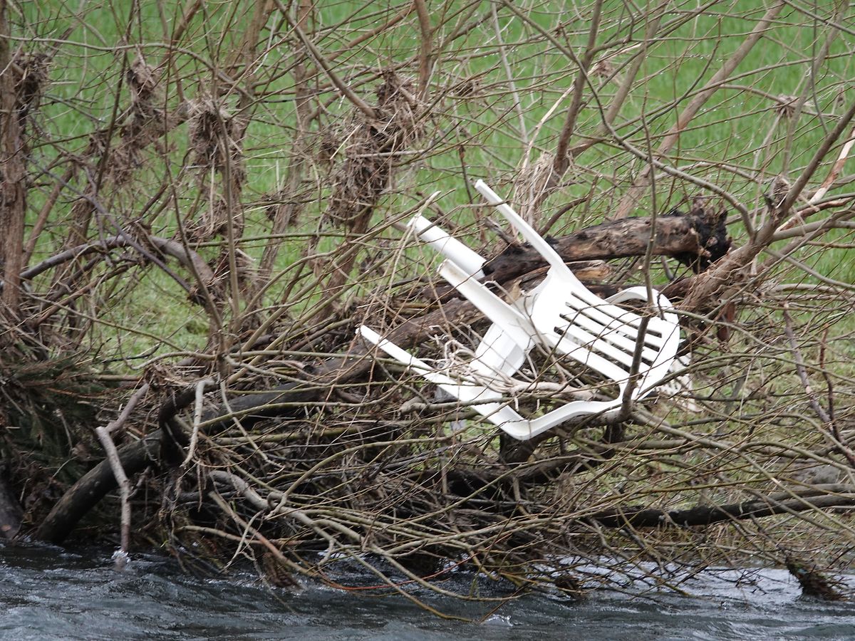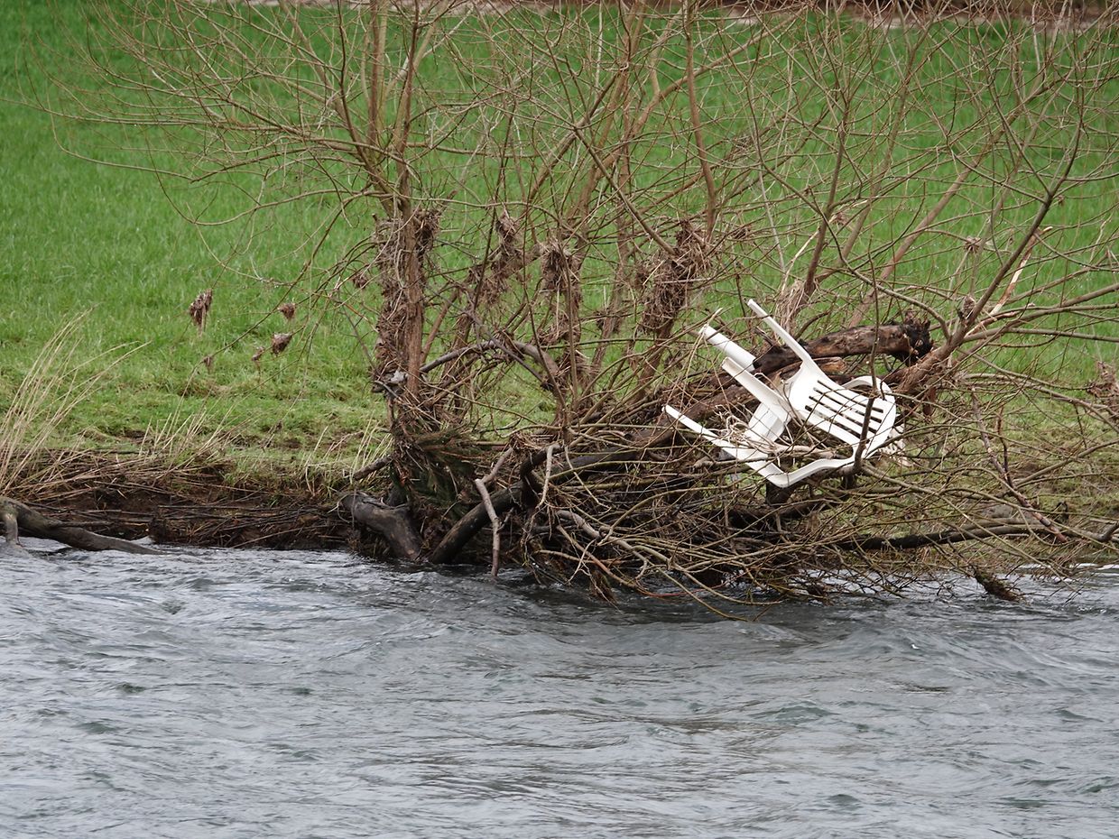 Einige Meter oberhalb der Sauerbrücke, welche zum Bahnübergang führt in Richtung Bürden, hat sich gelegentlich des neulichen Hochwassers ein weißer Campingsessel in den Ästen eines Strauches verfangen und hängt jetzt dort fest Wäre er nicht besser positioniert, so könnte er als wackelige Sitzgelegenheit benutzt werden, vorsichtshalber für gute Schwimmer.