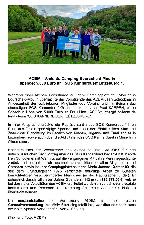Bourscheid ACBM Amis du Camping Bourscheid-Moulin / Don 5000€ SOS Kannerduerf, Mersch Marie-Jeanne Kremer Veröffentlicht am Donnerstag, 15. Juni 2023 um 18:07 Bourscheid-Moulin Bourscheid, Luxemburg Don vun 5.000 € un SOS Kannerduerf, Mersch Unpassenden Inhalt angeben Weitere Neuigkeiten von Marie-Jeanne Kremer > HIERKENOWEND ZU BUURSCHENT 03. an 04.02.2024 15.01.24 Bourscheid Concert CARÊME à Walferdange le 17.03.2023 03.03.23 Walferdingen Concert 30.12.22 Bourscheid Buurschent, Concert zu Gonschten vun der Ukraine, den 16.07.2022 21.07.22 Bourscheid CONCERT den 13.05.2022 zu Buurschent / den 19.05.2022 zu Miersch 25.04.22 Bourscheid