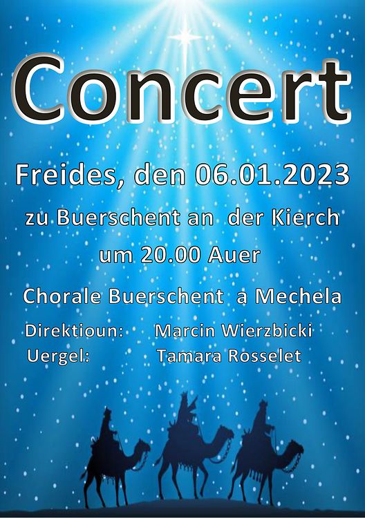 Bourscheid Concert Marie-Jeanne Kremer Veröffentlicht am Freitag, 30. Dezember 2022 um 08:50 Burscheid, Luxemburg Unpassenden Inhalt angeben Weitere Neuigkeiten von Marie-Jeanne Kremer > HIERKENOWEND ZU BUURSCHENT 03. an 04.02.2024 15.01.24 Bourscheid ACBM Amis du Camping Bourscheid-Moulin / Don 5000€ SOS Kannerduerf, Mersch 15.06.23 Bourscheid Concert CARÊME à Walferdange le 17.03.2023 03.03.23 Walferdingen Buurschent, Concert zu Gonschten vun der Ukraine, den 16.07.2022 21.07.22 Bourscheid CONCERT den 13.05.2022 zu Buurschent / den 19.05.2022 zu Miersch 25.04.22 Bourscheid