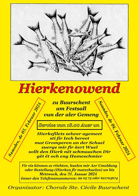 Bourscheid HIERKENOWEND ZU BUURSCHENT 03. an 04.02.2024 Marie-Jeanne Kremer Veröffentlicht am Montag, 15. Januar 2024 um 16:37 Burscheid, Luxemburg Umeldung bis Mettwoch, den 31.01.2024 Telefonsnummer : 990573 an 621705674 Unpassenden Inhalt angeben Weitere Neuigkeiten von Marie-Jeanne Kremer > ACBM Amis du Camping Bourscheid-Moulin / Don 5000€ SOS Kannerduerf, Mersch 15.06.23 Bourscheid Concert CARÊME à Walferdange le 17.03.2023 03.03.23 Walferdingen Concert 30.12.22 Bourscheid Buurschent, Concert zu Gonschten vun der Ukraine, den 16.07.2022 21.07.22 Bourscheid CONCERT den 13.05.2022 zu Buurschent / den 19.05.2022 zu Miersch 25.04.22 Bourscheid