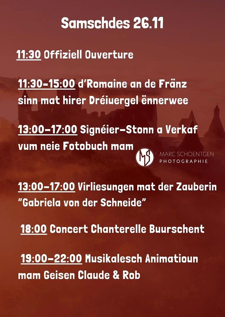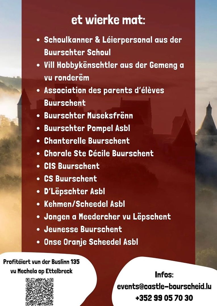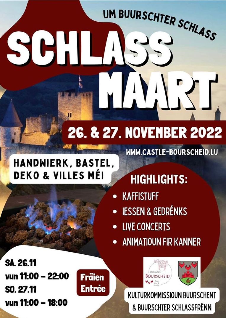 Bourscheid Schlassmaart zu Buurschent Schloss Bourscheid 4 Bildergalerie Bitte scrollen Sie nach unten,um weitere Bilder zu sehen. Veröffentlicht am Donnerstag, 3. November 2022 um 10:26 Burscheid, Luxemburg Unpassenden Inhalt angeben Weitere Neuigkeiten von Schloss Bourscheid > Schlassmaart zu Buurschent 03.11.25 Bourscheid Präisiwwerreechung um Buurschter Schlass 30.06.25 Bourscheid Schéckiwwerreechung um Buurschter Schlass 05.02.25 Bourscheid Schlassmaart zu Buurschent 29.10.24 Bourscheid