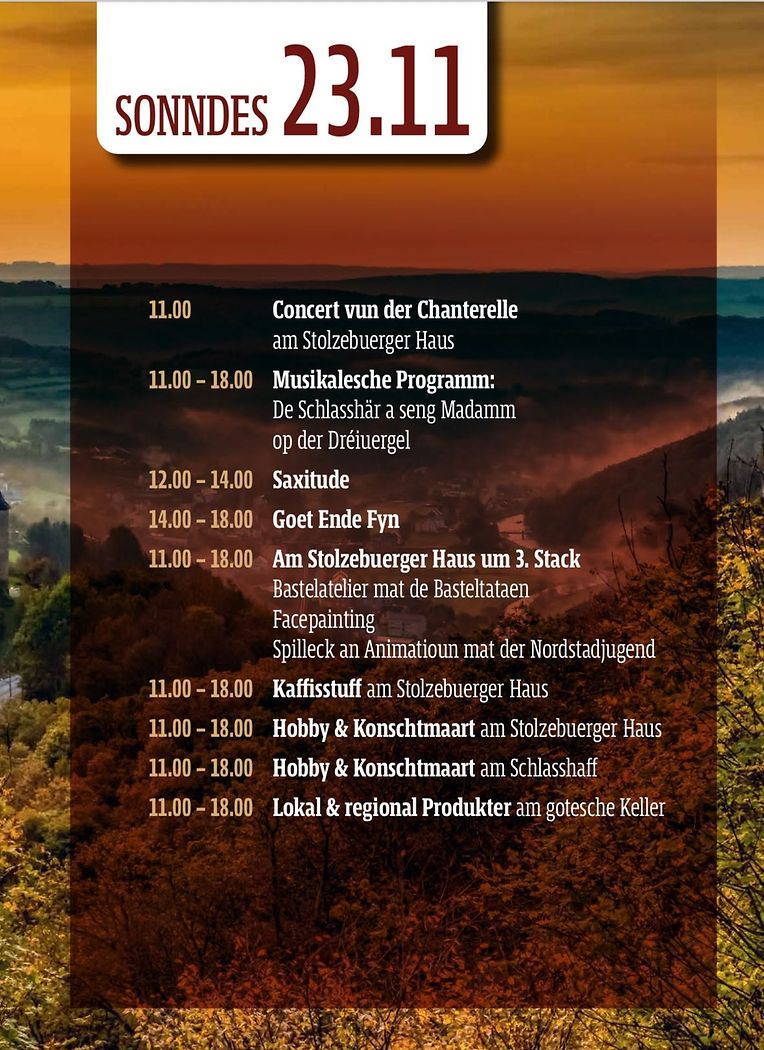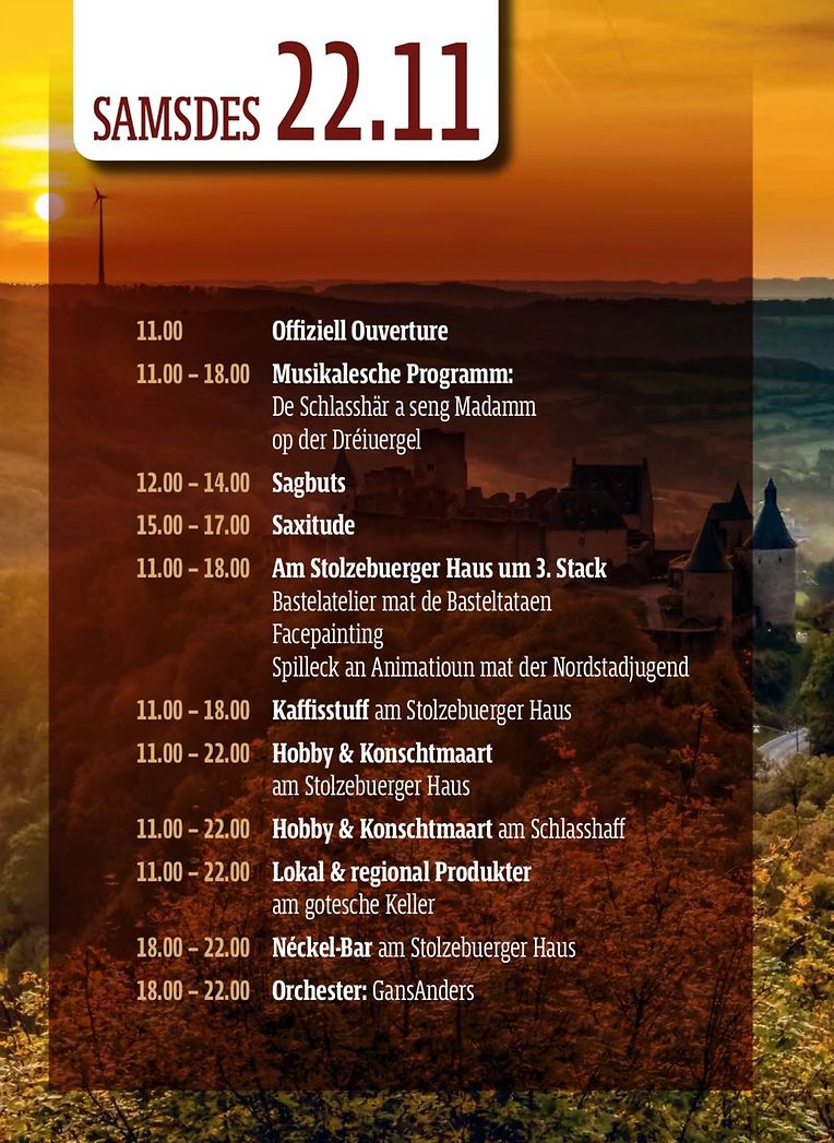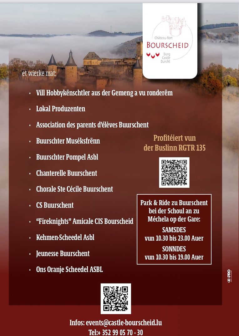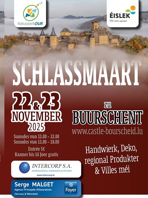 Bourscheid Schlassmaart zu Buurschent Schloss Bourscheid 4 Bildergalerie Bitte scrollen Sie nach unten,um weitere Bilder zu sehen. Veröffentlicht am Montag, 3. November 2025 um 17:13 1 Schlasswee, 9140 Bourscheid, Luxemburg Unpassenden Inhalt angeben Weitere Neuigkeiten von Schloss Bourscheid > Präisiwwerreechung um Buurschter Schlass 30.06.25 Bourscheid Schéckiwwerreechung um Buurschter Schlass 05.02.25 Bourscheid Schlassmaart zu Buurschent 29.10.24 Bourscheid Schlassmaart zu Buurschent 03.11.22 Bourscheid