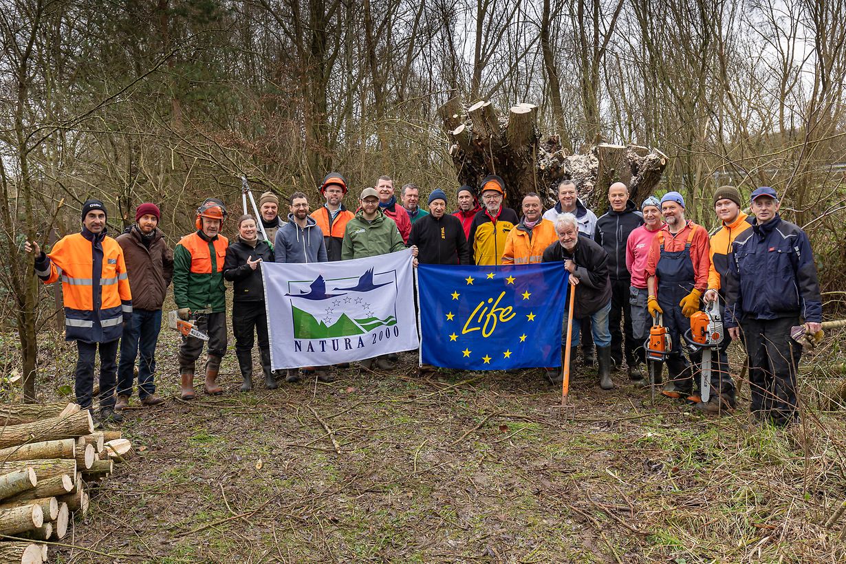 Heutzutage ist davon keine Rede mehr. Die markanten Bäume tragen aber weiterhin positiv zum Landschaftsbild bei, befestigen die Bachufer und bieten einer Vielzahl von Tieren einen Lebensraum. Deshalb organisiert die lokale Umweltkommission jährlich eine Schnittaktion, bei der eine Reihe von Kopfweiden fachgerecht zurückgeschnitten werden. Trotz kühler und feuchter Witterung fand die Aktion am 14. Januar entlang der Aalbaach , am Weierchen, in Bous statt . Die anfallenden Äste wurden dieses Jahr zum Anlegen einer Totholzhecke auch noch Benjeshecke genannt, weiterverwendet. Auf einer Länge von ca. 30m werden durch diese Anordnung neue Lebensräume für Insekten, Kleinsäuger und Vögel geschaffen. Stärkere Äste wurden auf 2,50m Länge geschnitten. Sie werden als Steckhölzer genutzt um anderenorts z.B. im Rahmen des Projektes LIFE Bats&Birds neue Kopfweiden zu pflanzen. Unterstützt wurden die Kommissionsmitglieder von zahlreichen, freiwilligen Helfern von Natur an Ëmwelt Kanton Réimech.