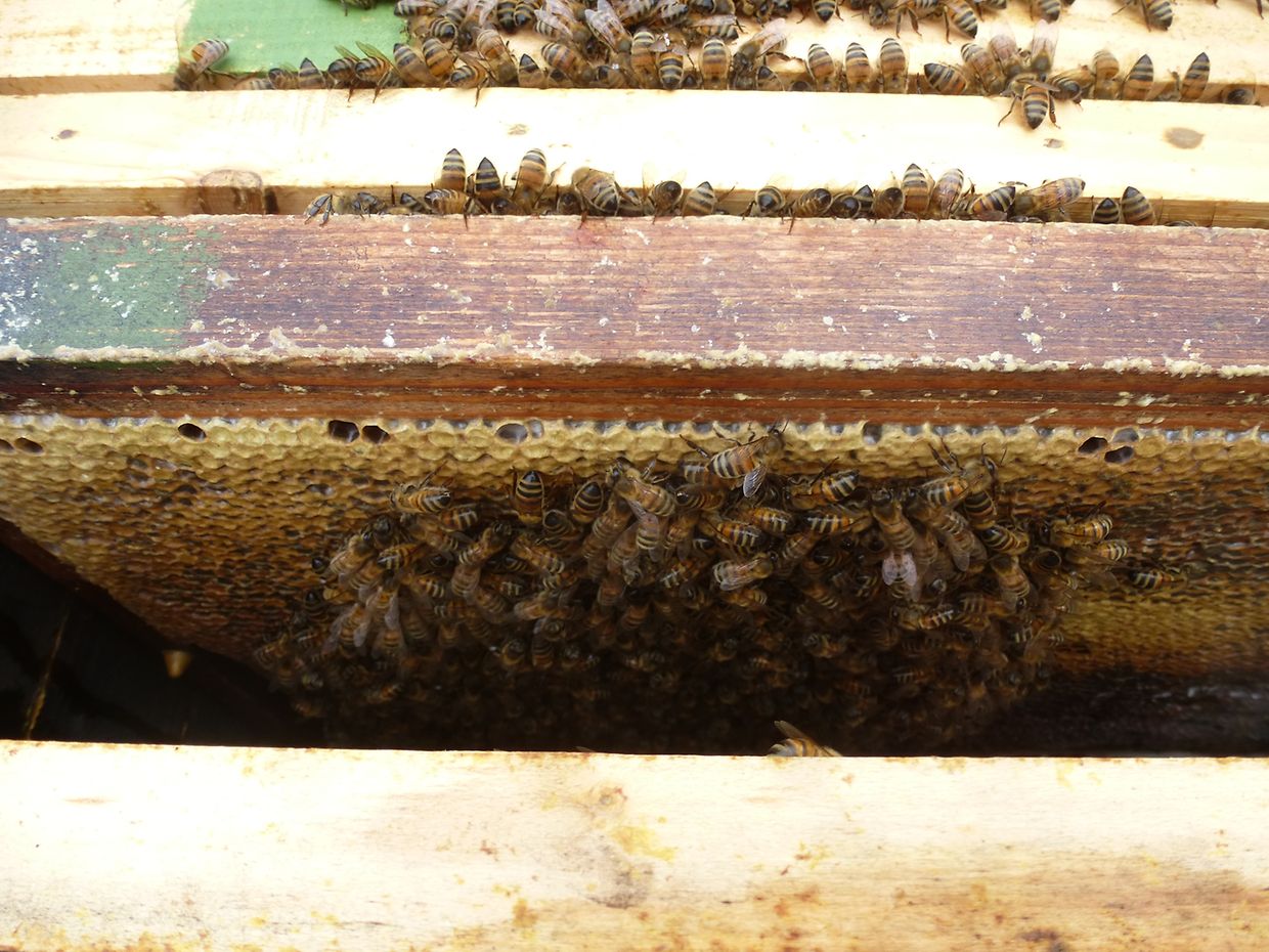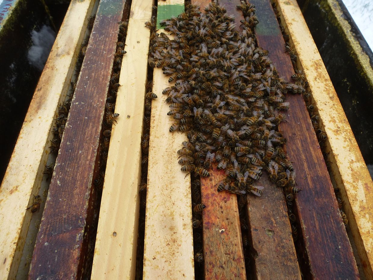 Futtersaft für die jungen Larven erzeugen die Arbeiterinnen um diese Zeit noch aus ihren eigenen Eiweiß- Körperreserven, später im Frühjahr nehmen sie dann Reservepollen aus den Waben auf. Honigreserven dienen als Energienahrung. Die von den Bienen jetzt nicht besetzten Wabenecken (Bild Beien3) sind sehr wichtig: Am Taupunkt zwischen warmer Traube und kalter Stockinnenluft zieht der Reservehonig in den Waben Wasser an. An wärmeren Tagen oder bei starker Sonneneinstrahlung nehmen die Arbeiterinnen dieses dünnflüssige Futter schnell auf und tragen es nach innen um.