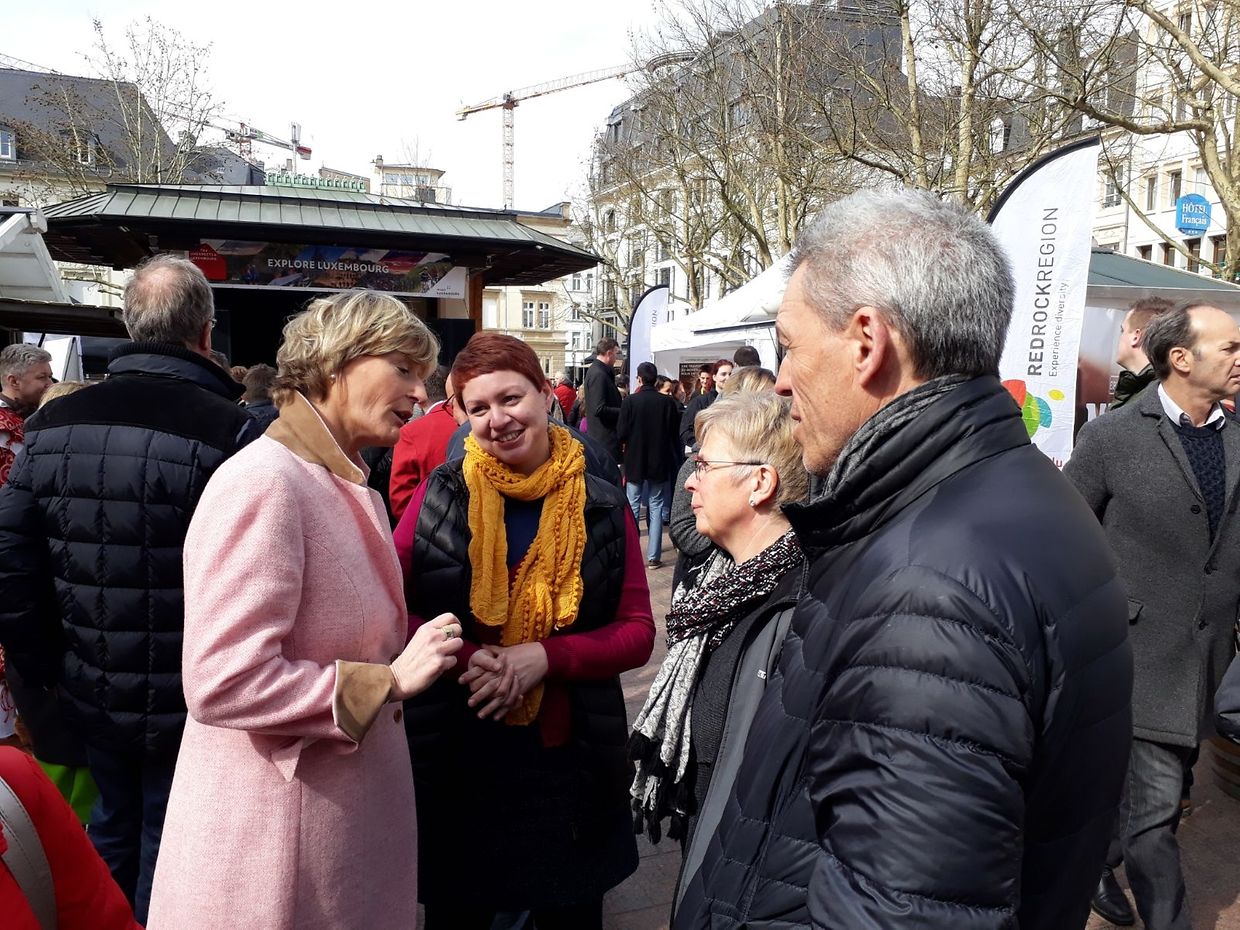 Mit vereinten Kräften konnte diese „Hauruck“-Aktion gemeistert werden. Das Ausstellungs-Material wurde in die Stadt Luxemburg transportiert, der Info-Stand wurde auf- und wieder abgebaut, und an beiden Tagen von morgens bis abends waren Freiwillige vor Ort, um den Interessenten Rede und Antwort zu stehen. Eine alte Schulbank, eine alte Schultafel, die früher getragenen Schuluniformen und einige Motive des Foto-Wettbewerbs Rindschleiden 2017, schmückten den Stand. Dazu wurden Flyer vom „Randschelter Pad“, sowie der Kirche und dem Museum verteilt. Besucher, nationaler und internationaler Herkunft, fragten interessiert nach mehr Informationen über den von RTL verbreiteten „Geheimtipp“ des Luxemburger Landes. Die Staatssekretärin Francine Closener, der Präsident des LCTO (Luxembourg City Tourist Office) Marc Angel, und auch Mike McQuaide, “An American in Luxembourg“, konnten nicht umhin, den Stand des Dorfes Rindschleiden zu bewundern.