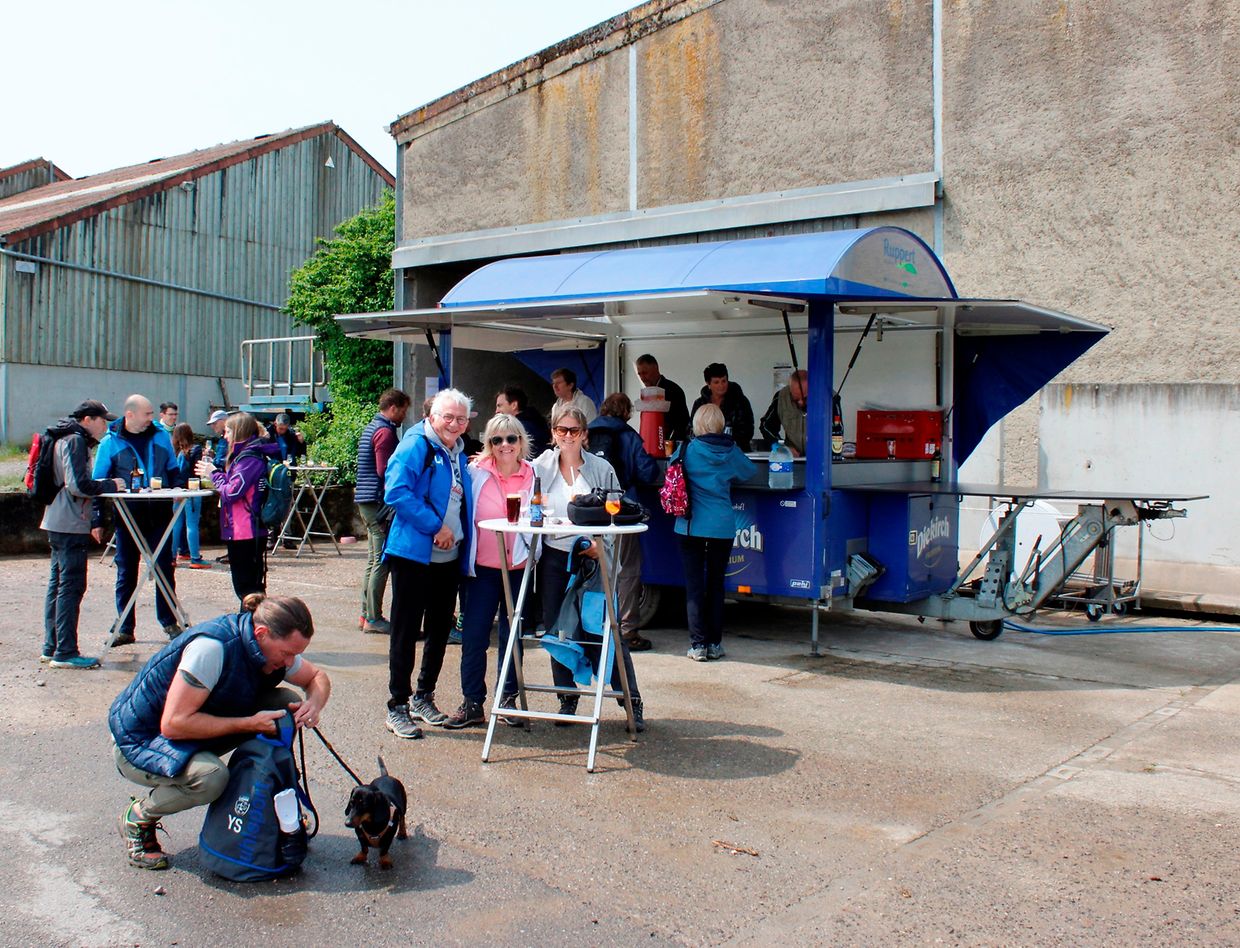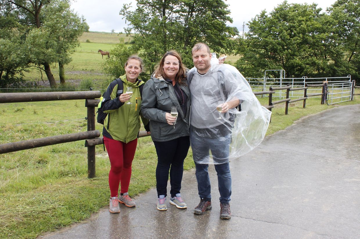 Der Startpunkt war das Sport- und Kulturzentrum „A Wëllems“. Zwischen 9:00 Uhr und 11:00 Uhr machten sich die Teilnehmerinnen und Teilnehmer auf den rund zwölf Kilometer langen Rundweg. Nach dem Empfang mit Croissants und Kaffee sowie der Ausgabe der Weingläser ging es zum Reithof der Familie Goergen. Dort wurden die Gäste mit einer erfrischenden „Coupe Crémant” und einer herzhaften Rieslingspastete oder einer sommerlichen Gemüserolle auf die kommenden Genüsse eingestimmt. Die bestens ausgeschilderte Strecke führte durch Wälder, Weinberge, Felder und das charmante Dorf Canach, das als das „Tor zur Mosel“ bekannt ist. Allerdings zeigte sich das Wetter von seiner launischen Seite: Regenschauer sorgten für nasse Kleidung und getrübte Stimmung. Eine Teilnehmerin brachte es mit einem Augenzwinkern auf den Punkt: „Die Temperatur muss nicht bei 30 Grad liegen, aber Regen wäre auch nicht nötig gewesen.“ Doch der kulinarische Genuss ließ die Laune nicht kippen.
