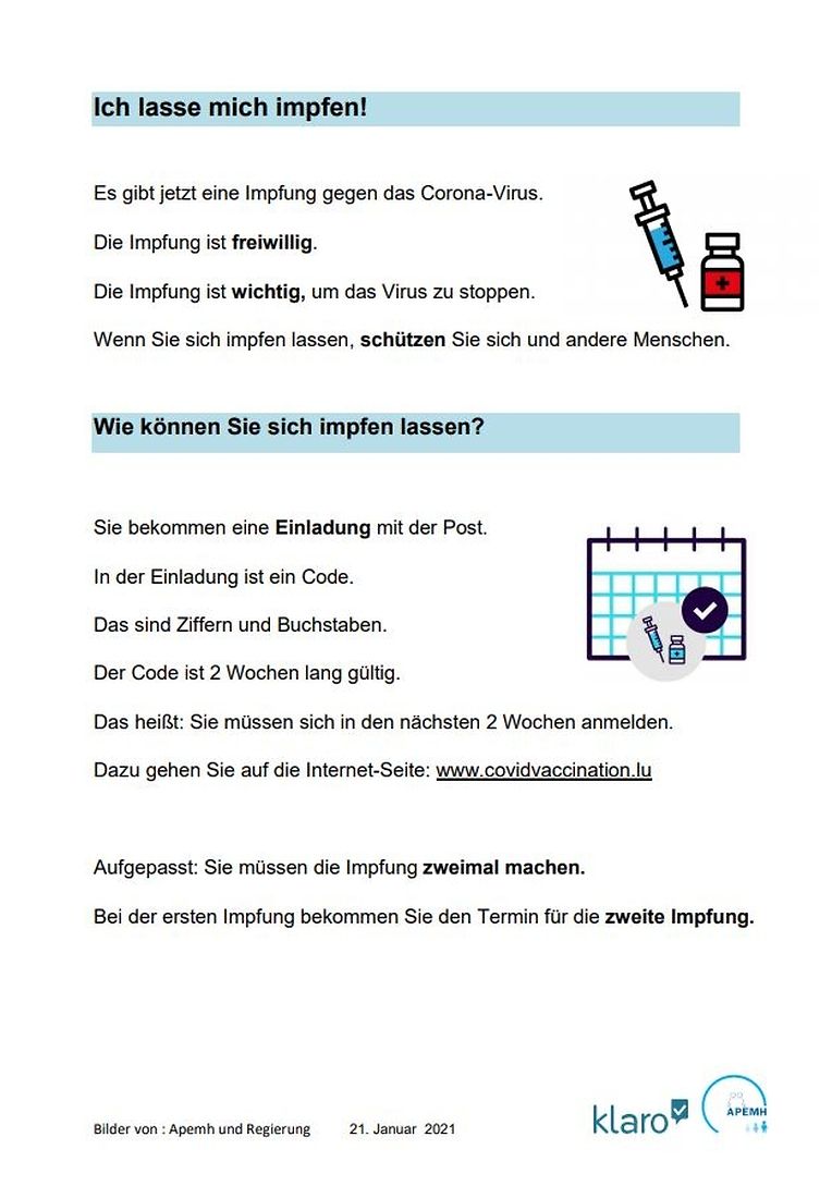 Zu diesem Zweck hat der „Klaro-Dienst“ der APEMH (Association des Parents d'Enfants Mentalement Handicapés) ein Dokument verfasst, um Personen im Behindertenbereich Informationen zur Covid-Impfung leichter zugänglich zu machen.