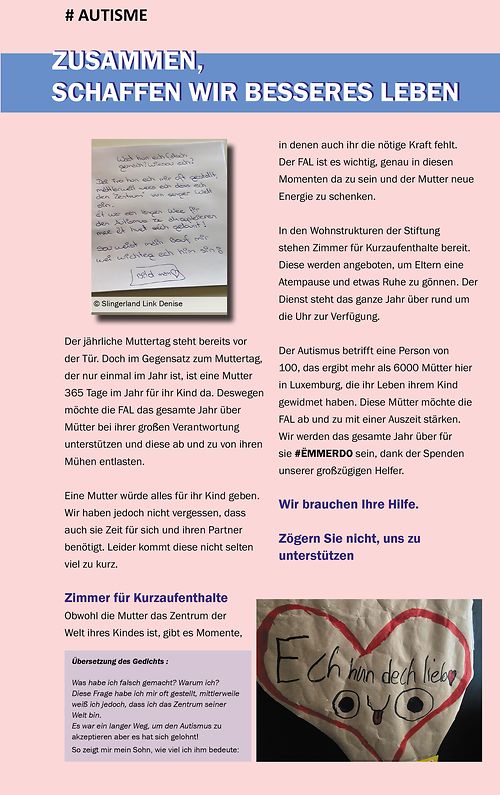 Am Virfeld vu Mammendag wëlle mir all de Mamme Merci soen, déi hier Kanner eisem edukativen Team vu Munzen a vu Rammerech uvertraut hunn. Dat ganzt Team mécht säi Bescht, fir si all Dag esou gutt wéi méiglech ze encadréieren an hinnen eng héchstméiglechst Liewensqualitéit ze bidden. Och op de reegelméissege Kontakt zur Famill gëtt Wäert geluecht. Zesummen, schafe mir bessert Liewen.