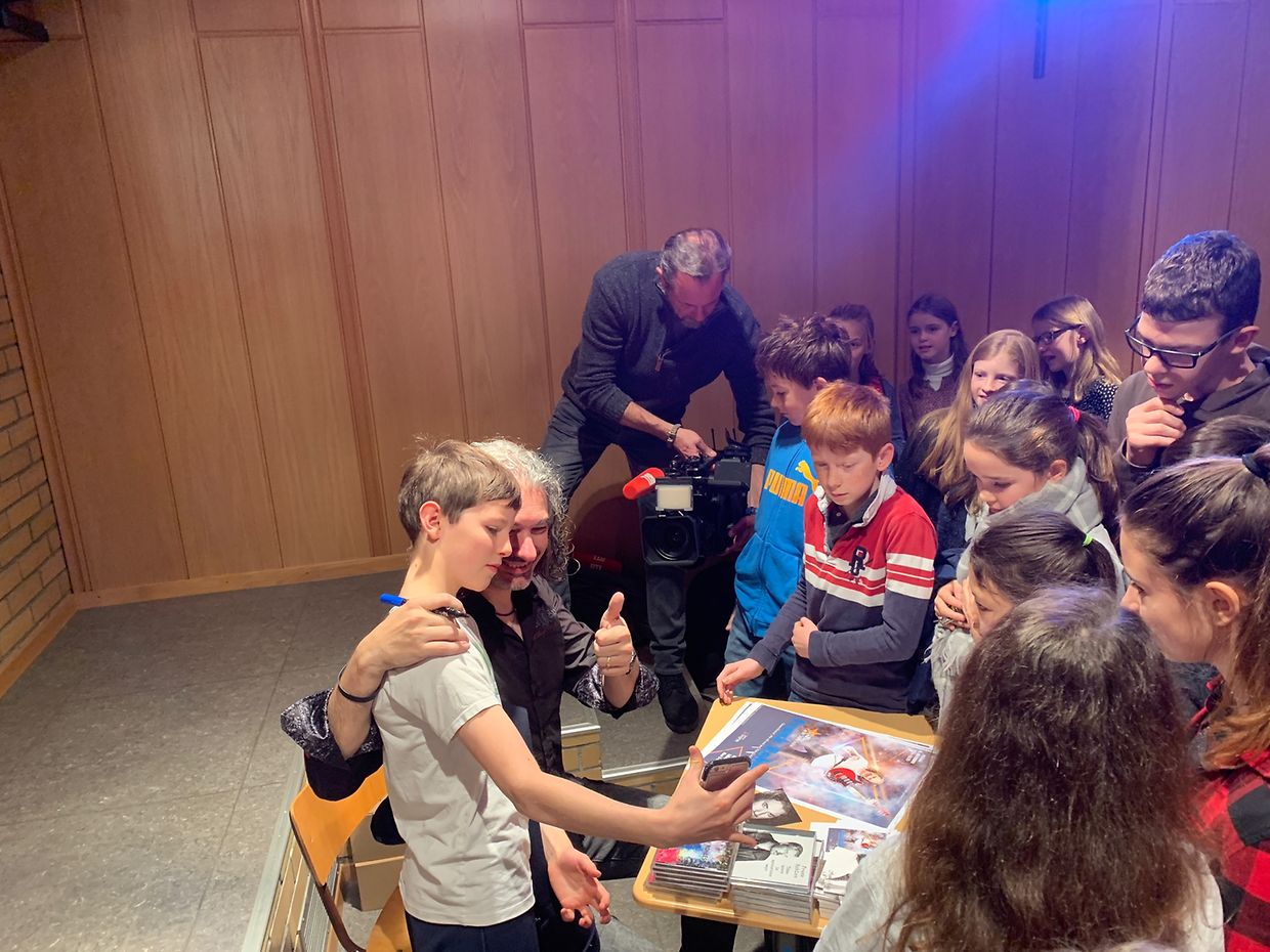 Frank Rohles vermittelte den Schülern anschaulich, dass es das Wichtigste im Leben ist, etwas zu machen, das einem Spaß bereitet und das man liebt. So übte Rohles in jungen Jahren um die fünf bis sechs Stunden täglich, um so Gitarre spielen zu können wie seine großen Idole. Dass Rohles dann 30 Jahre später mit genau diesen Idolen wie beispielsweise Brian May auf der Bühne stehen durfte, motivierte sicherlich den ein oder anderen Zuhörer. Gefolgt von weiteren Songs, auch eigenem Songmaterial von Rohles, endete der Morgen mit dem Queen-Song „We Are The Champions“. Die Champions waren am diesen Morgen die vielen Schüler, die „Stars in der Sainte-Sophie“ auch in ihrer Freizeit vorbereiteten. Die Begeisterung der anwesenden Jugendlichen zeichnete sich nicht nur in den begeisterten Gesichtern ab, sondern auch in der nicht endenden Schlange vor dem autogramm- und selfi-gebenden Frank Rohles.