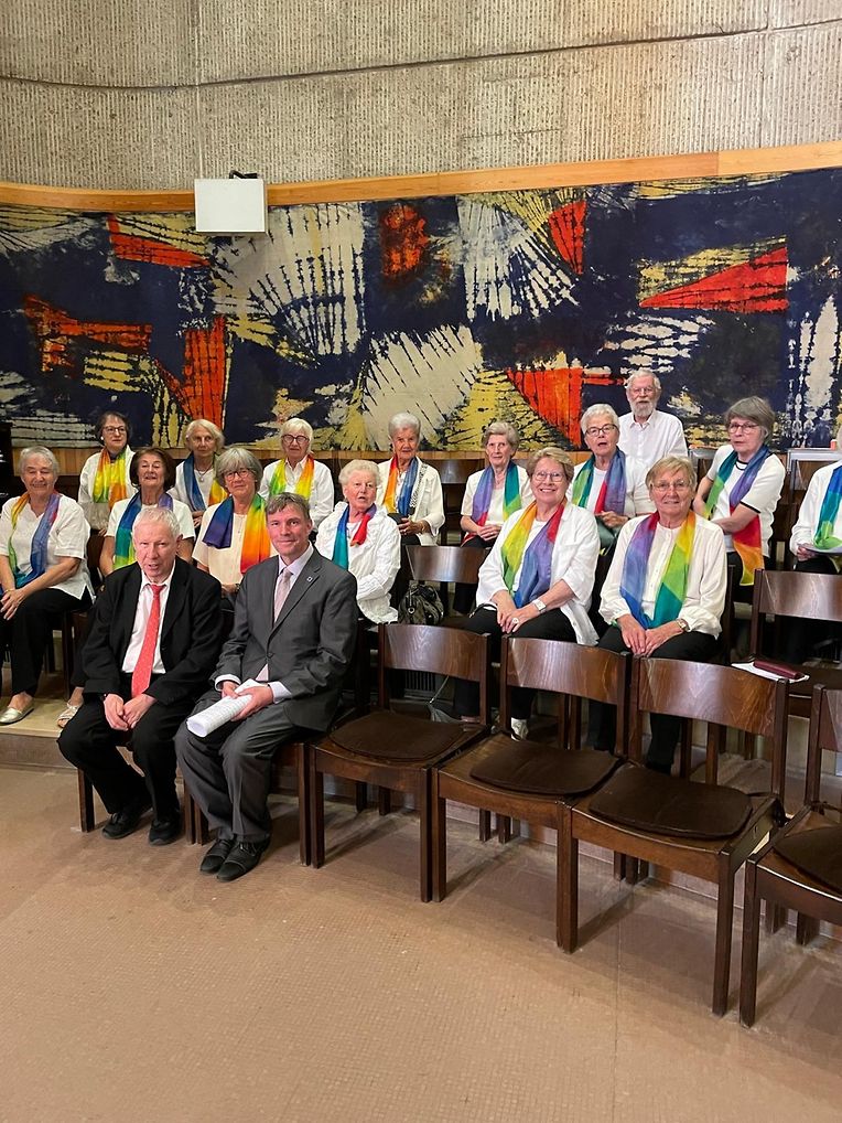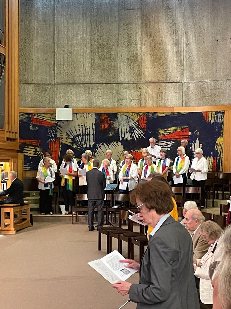 Musikalisch gestaltet wurde der gut besuchte Gottesdienst von den Mitgliedern der Chorale Ste Cécile Fetschenhof-Cents und dem Organisten Patrick Colombo, die (Europa-)Flagge zeigten, denn das Kergsche Kirchenfenster “Freude schöner Götterfunke” beflügelte die Sängerschar während einer Messfeier, die das “Label” zu Ehren Robert Schumans und für den Frieden in Europa trug.