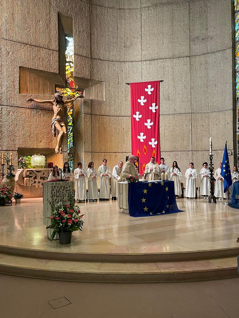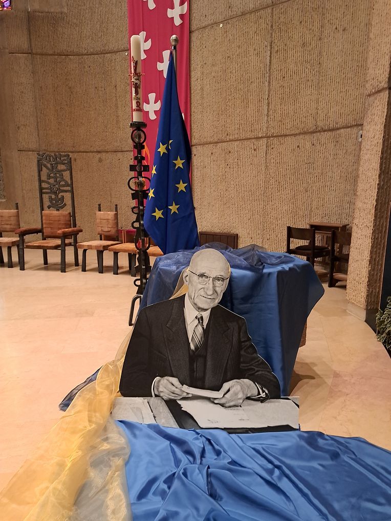 Am 13. Juli jährte sich der 75. Jahrestag der Ernennung Robert Schumans zum Ehrenbürger der Stadt Luxemburg. Aus diesem Anlass fand in Fetschenhof-Cents, wo Robert Schumans Eltern ihre letzte Ruhestätte haben, eine Messe zu Ehren des Initiators des Friedensprojektes Europa statt. Auf Einladung des Institut Saint-Benoît Patron de l’Europe, dessen Mitglieder sich für die Seligsprechung Robert Schumans einsetzen, der permanenten Vertretung der Europäischen Kommission in Luxemburg, des Centre de formation diocésain und der Pfarrei Notre-Dame präsidierte der Generalvikar Patrick Muller einen Gottesdienst vor den Lichtmauern Théo Kergs der Heilig-Geist-Kirche. In Anwesenheit u.a. der Botschafterin der Bundesrepublik Deutschland Dr. Heike Peitsch, dem EuGh-Richter François Biltgen, dem Abgeordneten und Gemeinderat Tom Weidig, dem Schuman-Biografen Manfred Kontz sowie dem Präfekten der Marianischen Bürgersodalität Trier Anton V. Wyrobisch zogen der Hauptzelebrant mit dem Präsidenten des Institut Saint-Benoît Patron de l’Europe Pfarrer Grégoire Corneloup und Diakon Michel Michaely sowie eine Messdienerschar, die zahlenmässig den zwölf goldenen Sternen der Europafahne entsprach, vor den mit der Europaflagge umhüllten Altar. Vor dem Taufbecken stand symbolträchtig ein Porträt des in Luxemburg geborenen Robert Schuman.