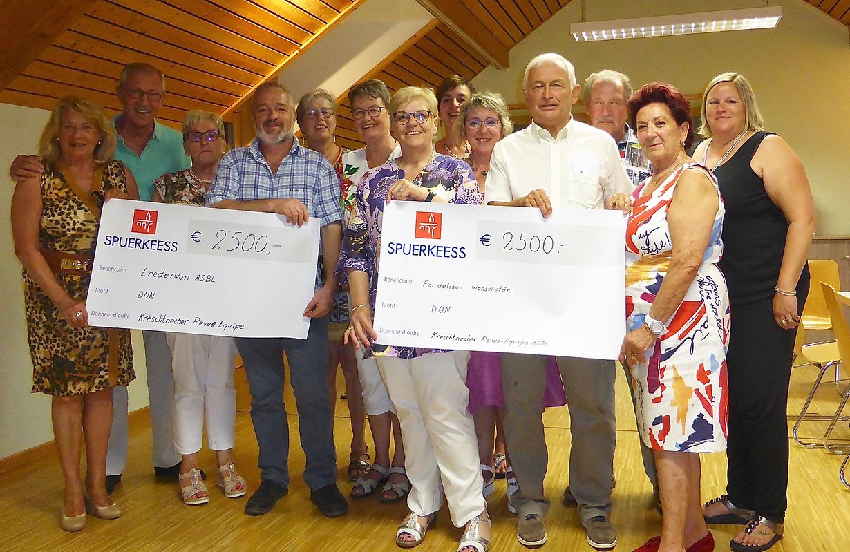 Getrei no hirem Motto: Spenden fir ee gudden Zweck, hunn déi verbliwwen  Memberen decidéiert fir Rescht vun hirer Keess ze spenden un zwou Organisatiounen. An zwar jeeweils 2.500 EURO un den "LEEDERWON asbl" an un "d'Fondatioun "de WONSCHSTÄR".