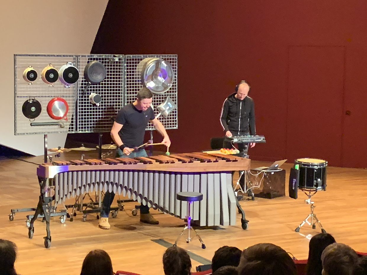 Im Kammermusiksaal der Philharmonie angekommen, erblickten die Jugendlichen, neben bekannten Instrumenten wie Snaretrommeln, Marimba und Djembé, auch an einem Ständerwerk hängende Kochtöpfe, Pfannen, Waschschüsseln und Topfdeckel. Sicherlich gingen bei dem ein oder anderen alles Mögliche durch den Kopf, aber nicht, dass gleich der als weltbeste Percussionist gefeierte Grubinger auf der Bühne stehen wird.