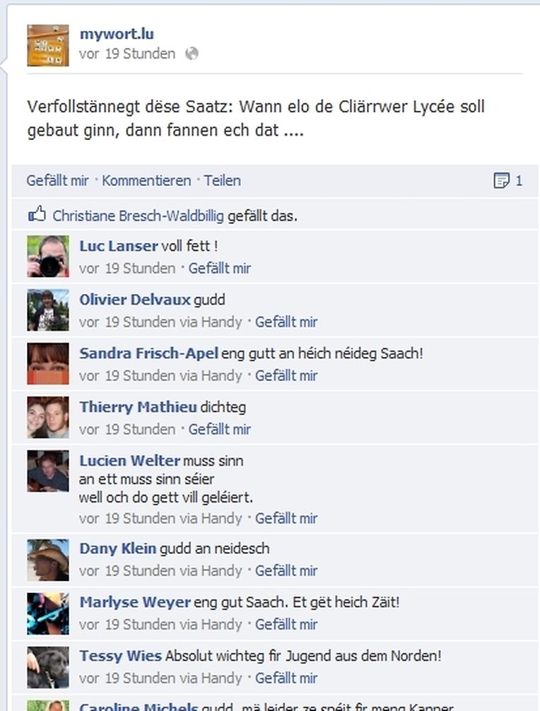 (L.E.) - Vervollständigen Sie diesen Satz: „Wenn nun der „Cliärrwer Lycéee“ gebaut werden soll, dann finde ich das ...“. So lautete die Frage die die mywort-Redaktion am Mittwoch ihren Lesern auf Facebook gestellt hatte.