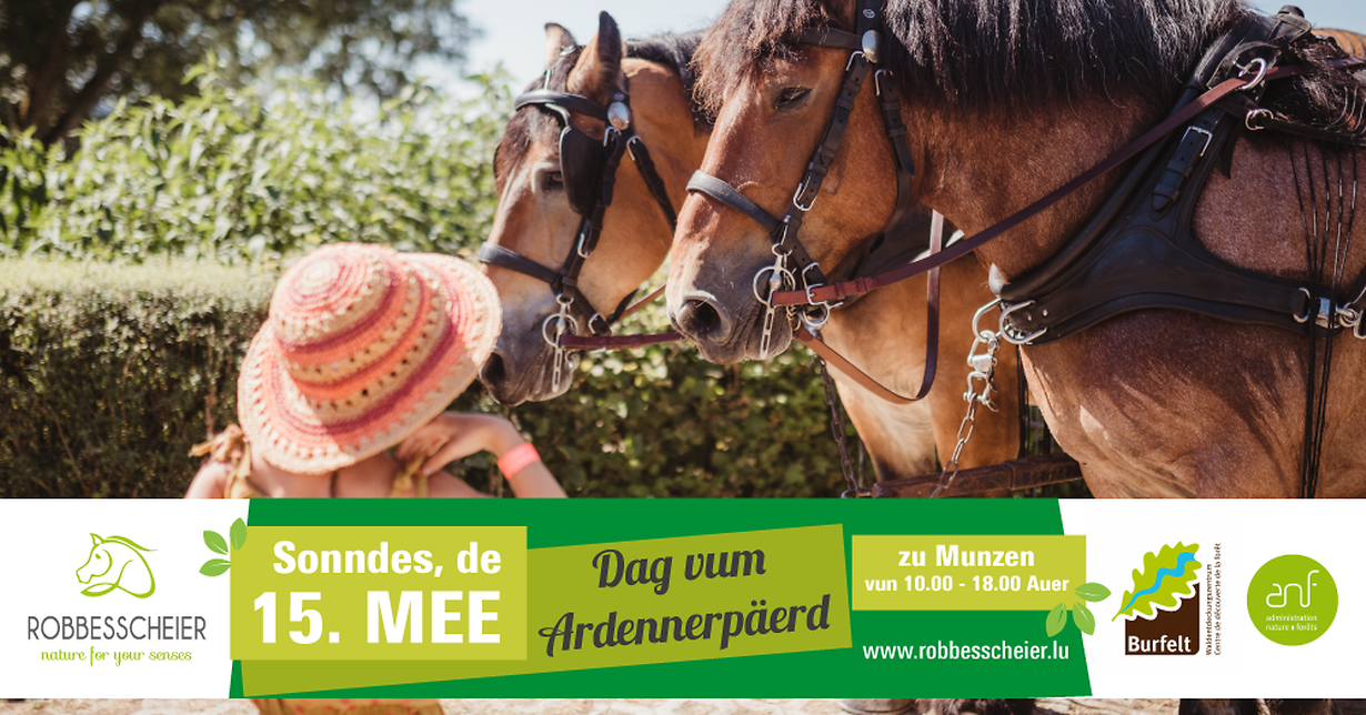 Im Naturzentrum Robbesscheier steht dieses Jahr die 31. Ausgabe des Traditionsfestes an. Der Umweltschutz, die Waldarbeit wie auch die Naturpädagogik rücken an diesem Tag in das Zentrum des Geschehens. In den Animationen, Vorführungen und Informationen die sich an Jung und Alt richten, wird das Aushängeschild der Robbesscheier, das Ardenner Zugpferd, die Hauptrolle einnehmen.