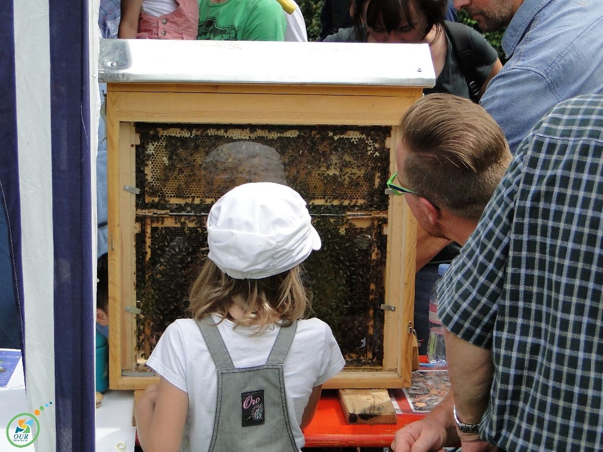 Och um drëtte Naturparkfest vum Naturpark Our am Parc Housen hu mir matgemat. No de gudden Erfahrungen vum letzte Joer ware mir den 3. August fréi um Dill fir eise Stand anzeriichten. Zwee Beievölker ware schuns e puer Deeg éischter op d’Plaz bruecht ginn fir den Drohnelotto. Dem gléckleche Gewënner (seng Drohn war als éischt zréck an de Beiestack komm) vun deem Concours konnte mer e flotte Cadeau ginn. Do dernierft hate mer eise Schaukasten mat derbäi, wou mer de Leit d’Beien ganz no (an ouni Angst mussen ze hunn) konnte weisen. D'Kinnigin huet sech méi wéi eng Kéier gutt verstoppt, sou datt et och do munnechmol e klenge Concours gouf, ween së fir d’ischt ging fannen. Fir d’Kanner hate mer e Beiememory a beim Keiser Carlo a senger Fra vum Beienascht konnte si eng Wueskäerz rullen. Ganz interessant war och de Richconcours – do gung et drëms dat méi onbekannte Beieprodukt Propolis mat der Nues ze erkennen. Déi 5 aner Produkter fir ze richen aus dem Gaart respektiv der Kichen ware nämlech méi liicht ze erroden. A selbstverständlech duerft de frësch geschleiderten Hunneg net op eisem Stand feelen. Sou goufe net manner wéi 270 Gläser op der Plaz agefëllt a verschenkt (dank der Ënnerstëtzung vum Naturtpark). D’Hunnegdrëpp war dann éischter eppes fir déi, wou mol eng aner Form vu Branntwäin wollten ausprobéieren. E Beiequiz mat dräizéng Froen déi all Kéiers ee Buschtaw vum Léisungswuert erginn hunn, war eng weider Attraktioun op eisem Stand. Déi, wou den Erklärungen zum Beievollek nogelauschtert haten, konnten dës Froen mat méi oder manner Liichtegkeet beäntweren an och si kruten e Beienautocollant als Belounung. Ofgeronnt gouf dat Ganzt mam Virstellen vun den Ourdaller Produkter.