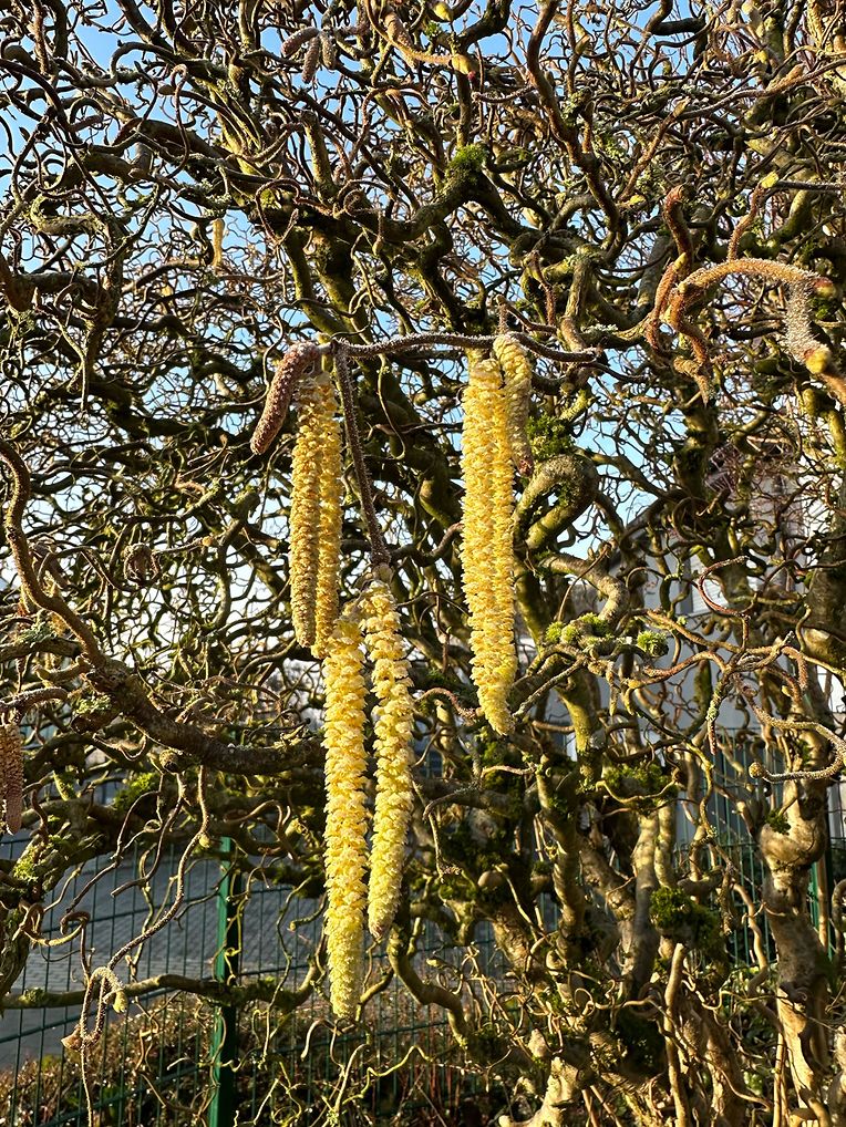 Die Korkenzieherhasel (Corylus avellana ‘Contorta’) ist eine Sonderform der Gemeinen Hasel (Corylus avellana). Lange vermutete man, dass sie aus einer spontanen Mutation entstanden ist, inzwischen sieht man eine ungefährliche Krankheit der Gemeinen Hasel als wahrscheinlicher an. Erstmalig wurde der gedrehte Strauch um 1900 in England entdeckt und beschrieben. Haselnusssträucher gehören zur Familie der Birkengewächse (Betulaceae). Sie sind in Mitteleuropa und Kleinasien heimisch und haben vor allem aufgrund ihrer schmackhaften Früchte eine lange gartenbauliche Tradition.