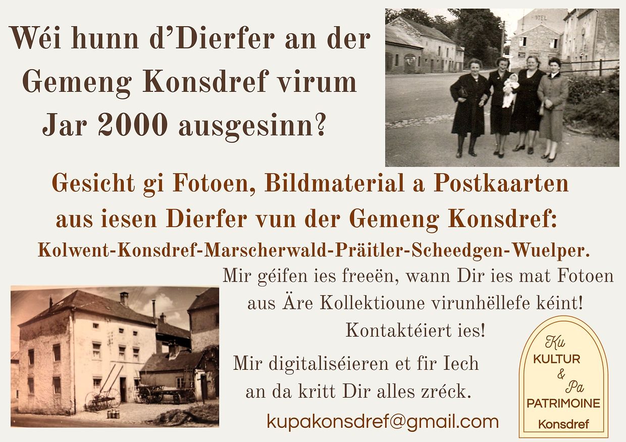 D’ASBL Kultur a Patrimoine Konsdref (KuPa) wier frou, wann Dir al Fotoen a Postkaarten aus der Gemeng Konsdref mat eis ze deele géift.