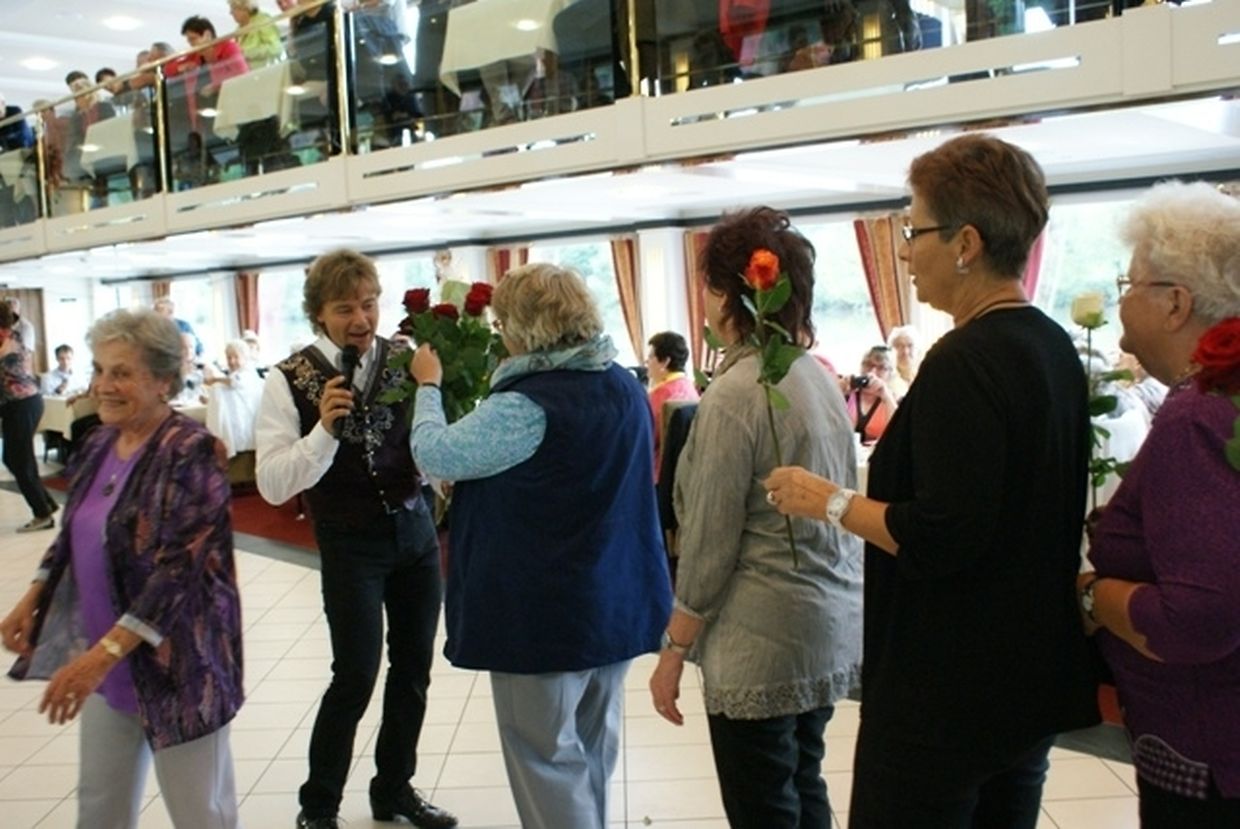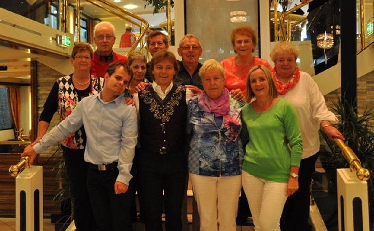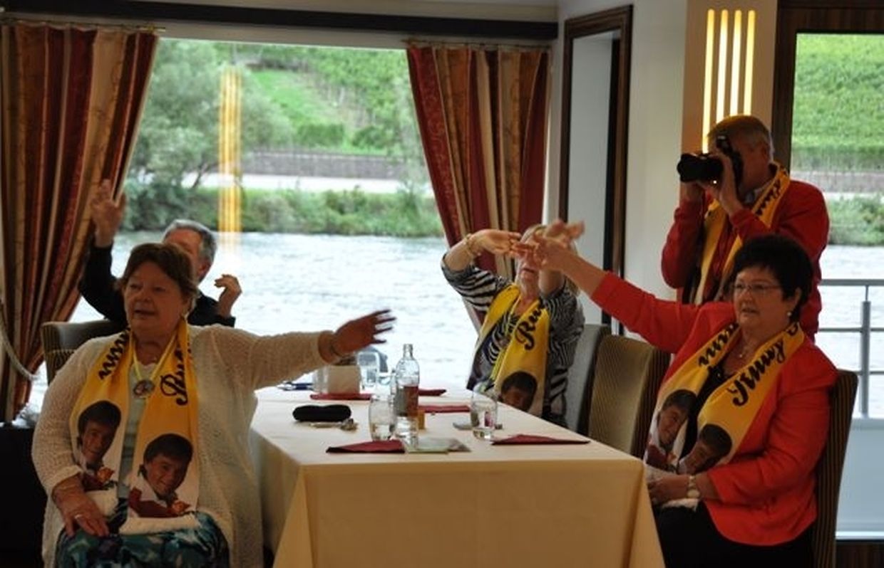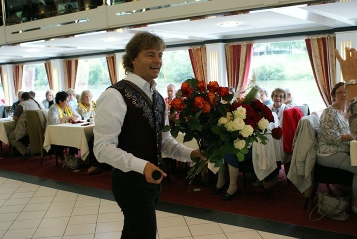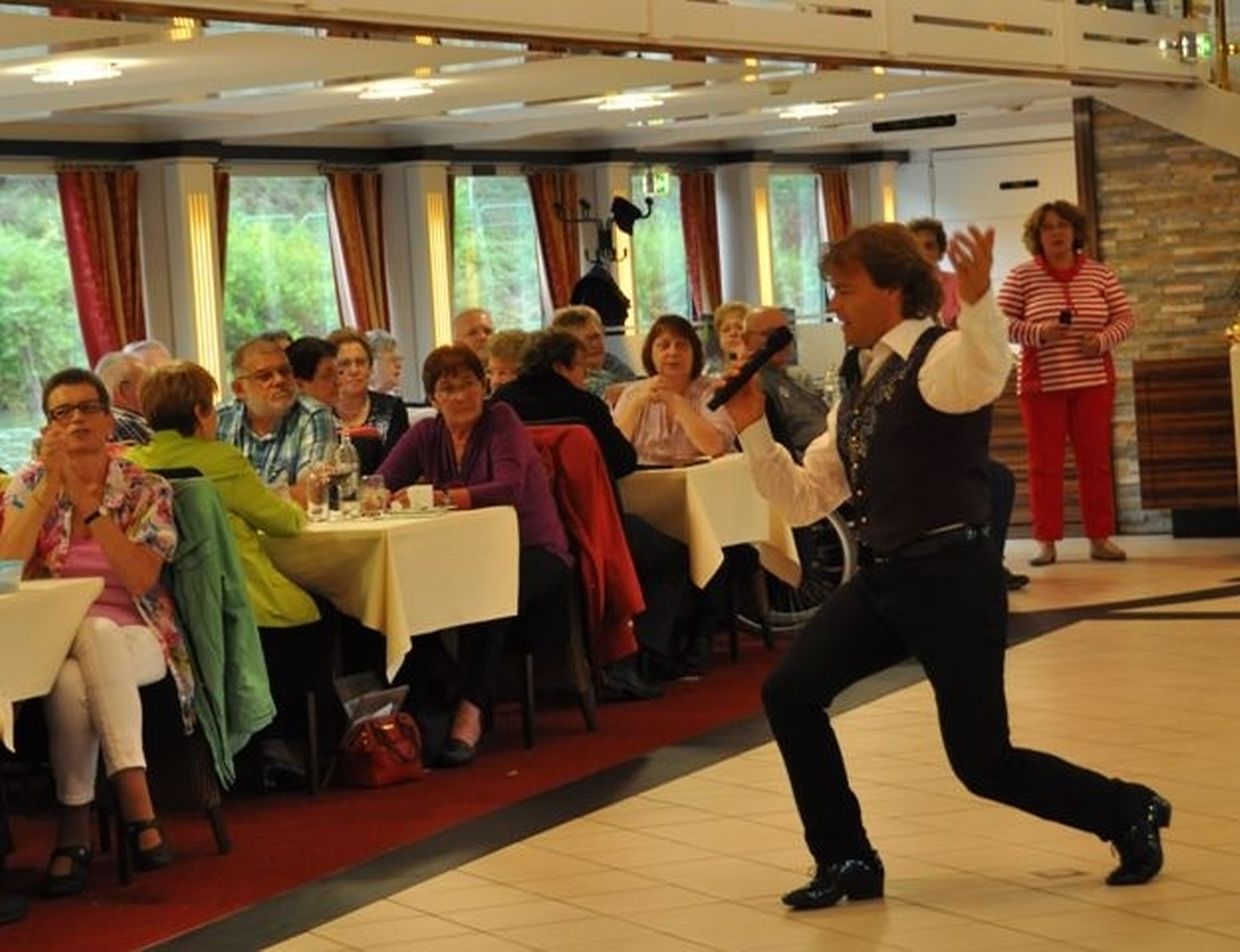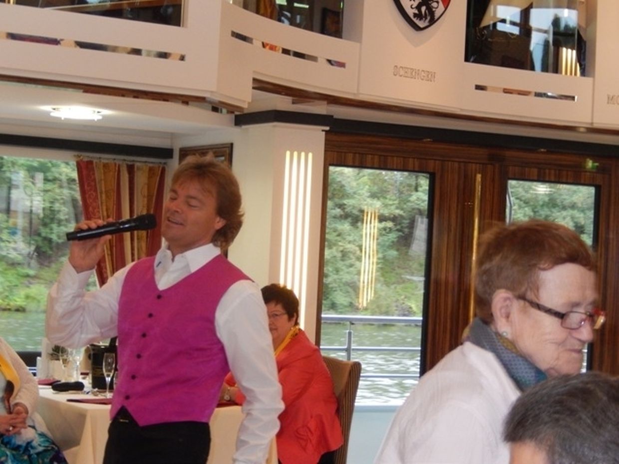 In meiner Eigenschaft als Präsidentin konnte ich an beiden Tagen neben unseren Mitgliedern, welche sich zahlreich eingefunden hatten, auch die Amiperas aus Cruchten und den Sparverein „de leschte Sou“ aus Oberbesslingen und vielen Freunden aus ganz Luxemburg begrüßen. Neben den vielen angereisten Gästen aus allen Teilen Deutschland konnte ich heuer wieder Ute Fritzsch, die zum 2.ten Mal mit Ihrem Fan Club im vollbesetzten Bus aus dem Erzgebirge und mit unzähligen Rosen im Gepäck angereist war um auf unserer Moselrundfahrt mit Rudy Giovannini dabei zu sein. Sebastian Depling, der gehbehinderte junge Mann aus der Leipziger Gegend war mit Familie und Freunden angereist um mit seinem Vorbild Rudy zu singen, denn diese gemeinsame musikalischen Auftritte geben Sebastian Kraft und Lebensmut um mit seinem Schicksalsschlag besser und leichter um zugehen. Viele liebe und treue Freunde waren aus Belgien extra angereist um mit Rudy auf der Mosel zu singen und zu feiern und so herrschte trotz Wind und Regen eitel Sonnenschein und eine supertolle Stimmung während beiden Tagen an Bord der MS „Princesse Marie Astrid“.