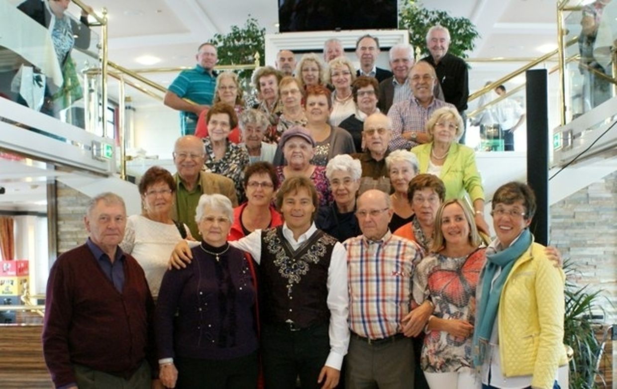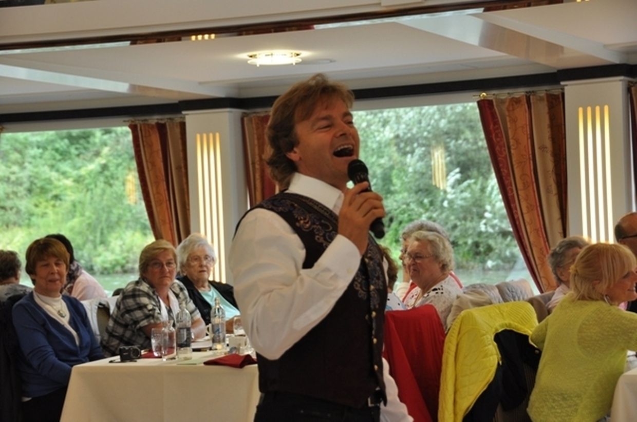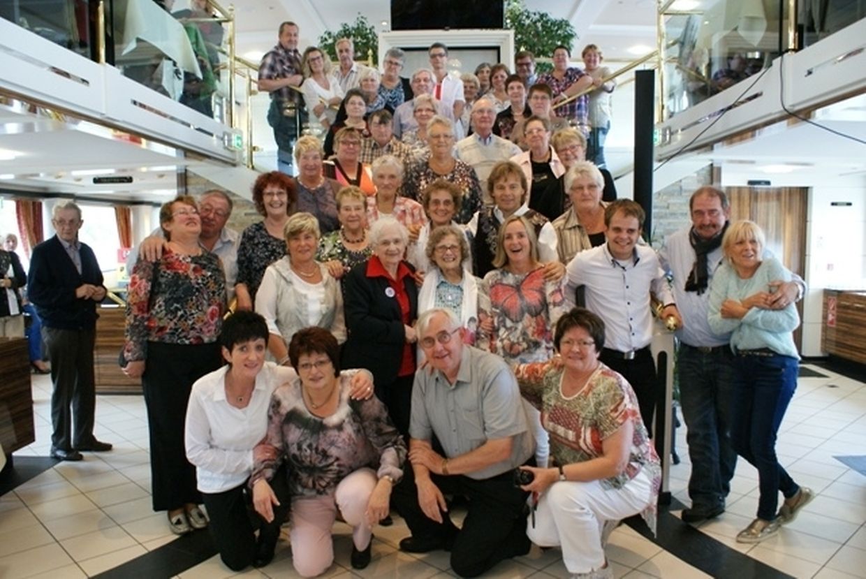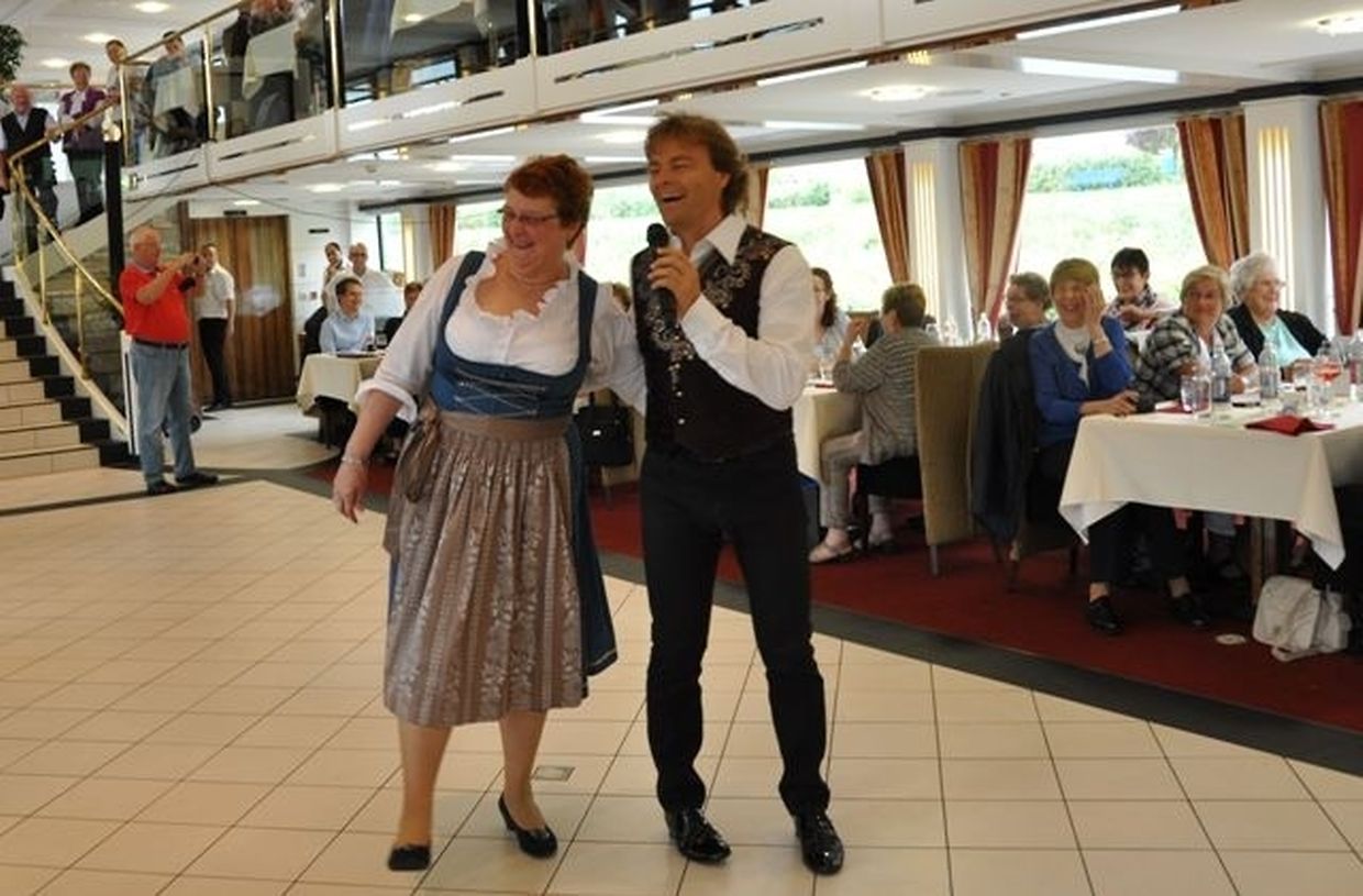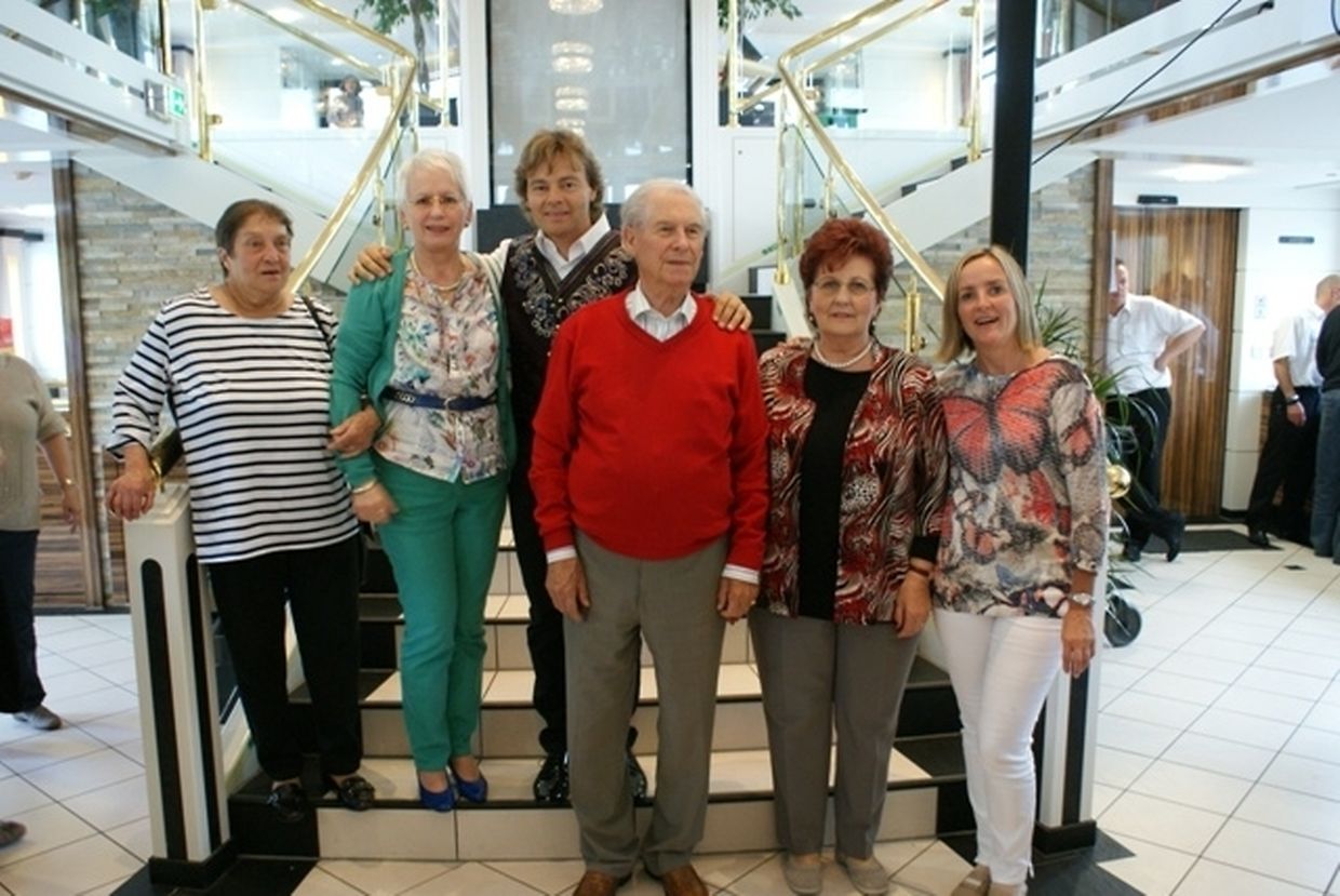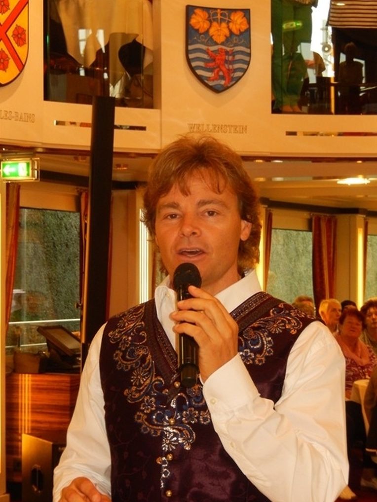 In meiner Eigenschaft als Präsidentin konnte ich an beiden Tagen neben unseren Mitgliedern, welche sich zahlreich eingefunden hatten, auch die Amiperas aus Cruchten und den Sparverein „de leschte Sou“ aus Oberbesslingen und vielen Freunden aus ganz Luxemburg begrüßen. Neben den vielen angereisten Gästen aus allen Teilen Deutschland konnte ich heuer wieder Ute Fritzsch, die zum 2.ten Mal mit Ihrem Fan Club im vollbesetzten Bus aus dem Erzgebirge und mit unzähligen Rosen im Gepäck angereist war um auf unserer Moselrundfahrt mit Rudy Giovannini dabei zu sein. Sebastian Depling, der gehbehinderte junge Mann aus der Leipziger Gegend war mit Familie und Freunden angereist um mit seinem Vorbild Rudy zu singen, denn diese gemeinsame musikalischen Auftritte geben Sebastian Kraft und Lebensmut um mit seinem Schicksalsschlag besser und leichter um zugehen. Viele liebe und treue Freunde waren aus Belgien extra angereist um mit Rudy auf der Mosel zu singen und zu feiern und so herrschte trotz Wind und Regen eitel Sonnenschein und eine supertolle Stimmung während beiden Tagen an Bord der MS „Princesse Marie Astrid“.