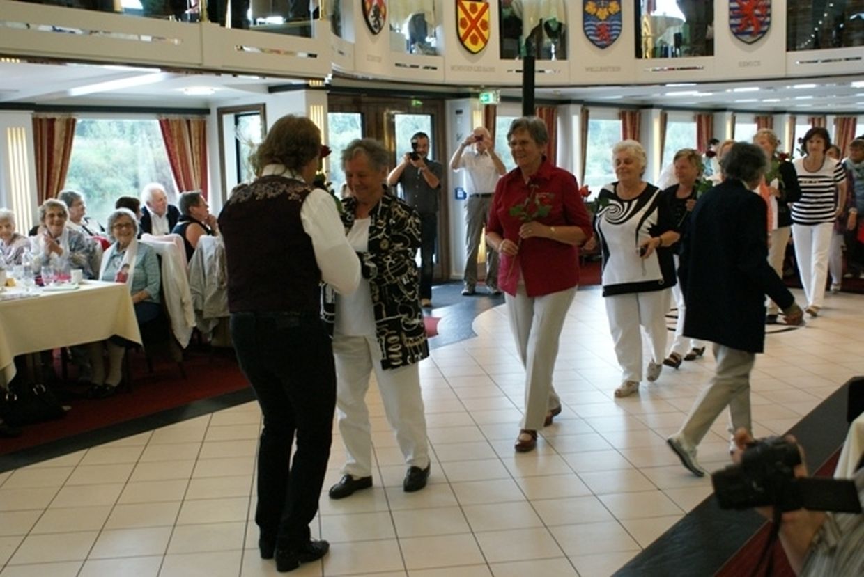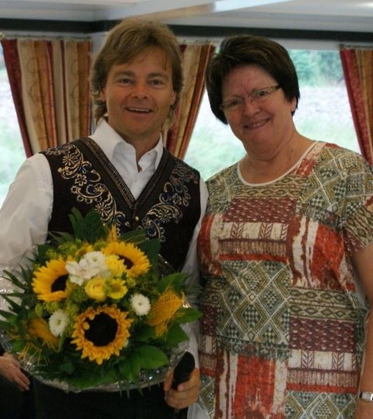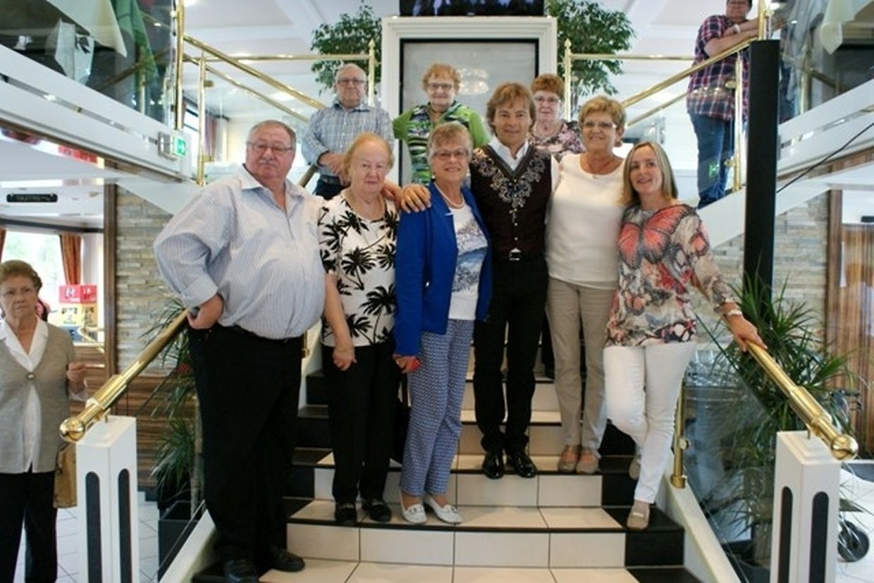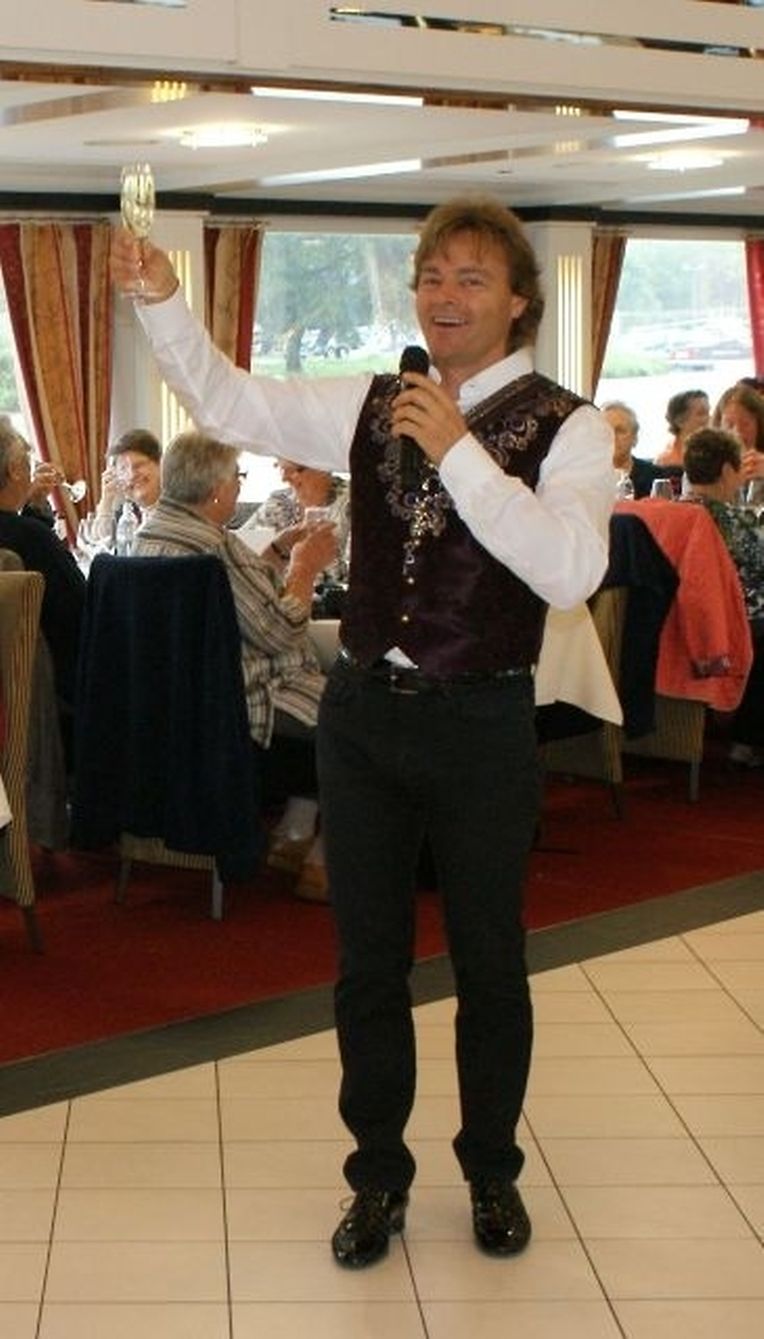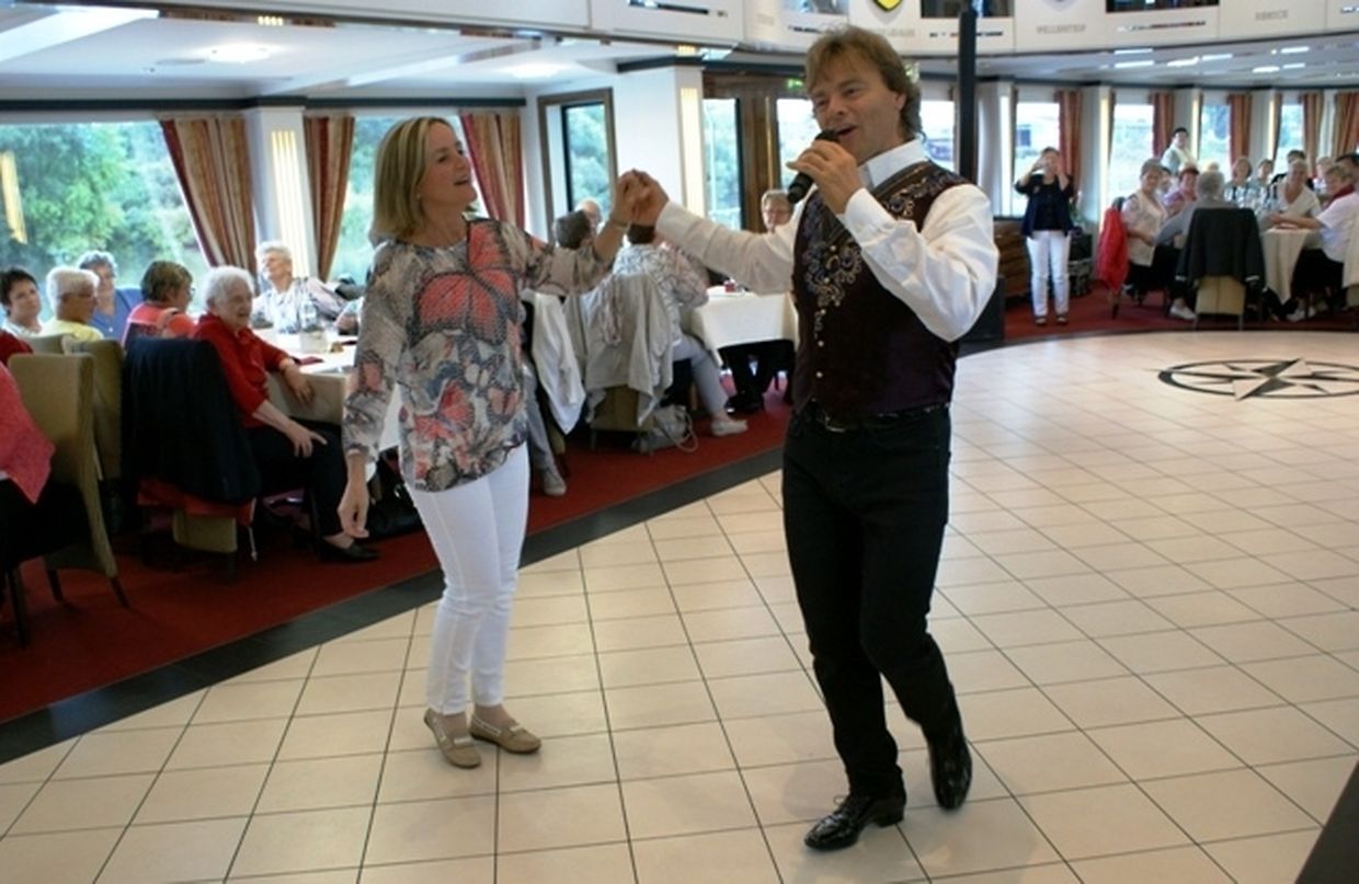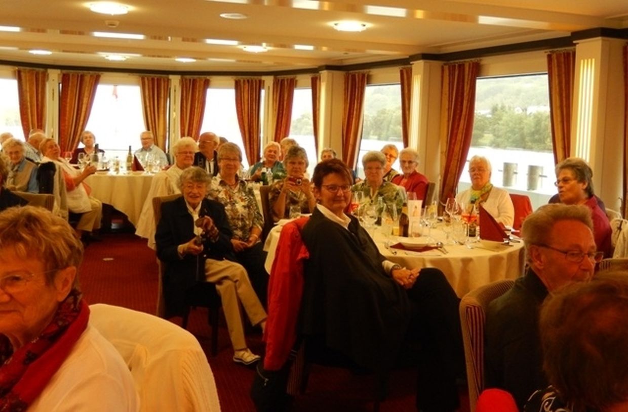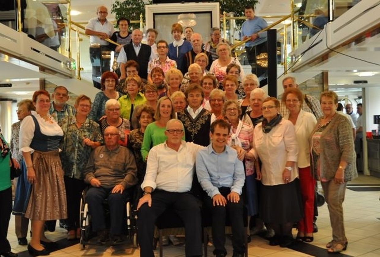 In meiner Eigenschaft als Präsidentin konnte ich an beiden Tagen neben unseren Mitgliedern, welche sich zahlreich eingefunden hatten, auch die Amiperas aus Cruchten und den Sparverein „de leschte Sou“ aus Oberbesslingen und vielen Freunden aus ganz Luxemburg begrüßen. Neben den vielen angereisten Gästen aus allen Teilen Deutschland konnte ich heuer wieder Ute Fritzsch, die zum 2.ten Mal mit Ihrem Fan Club im vollbesetzten Bus aus dem Erzgebirge und mit unzähligen Rosen im Gepäck angereist war um auf unserer Moselrundfahrt mit Rudy Giovannini dabei zu sein. Sebastian Depling, der gehbehinderte junge Mann aus der Leipziger Gegend war mit Familie und Freunden angereist um mit seinem Vorbild Rudy zu singen, denn diese gemeinsame musikalischen Auftritte geben Sebastian Kraft und Lebensmut um mit seinem Schicksalsschlag besser und leichter um zugehen. Viele liebe und treue Freunde waren aus Belgien extra angereist um mit Rudy auf der Mosel zu singen und zu feiern und so herrschte trotz Wind und Regen eitel Sonnenschein und eine supertolle Stimmung während beiden Tagen an Bord der MS „Princesse Marie Astrid“.