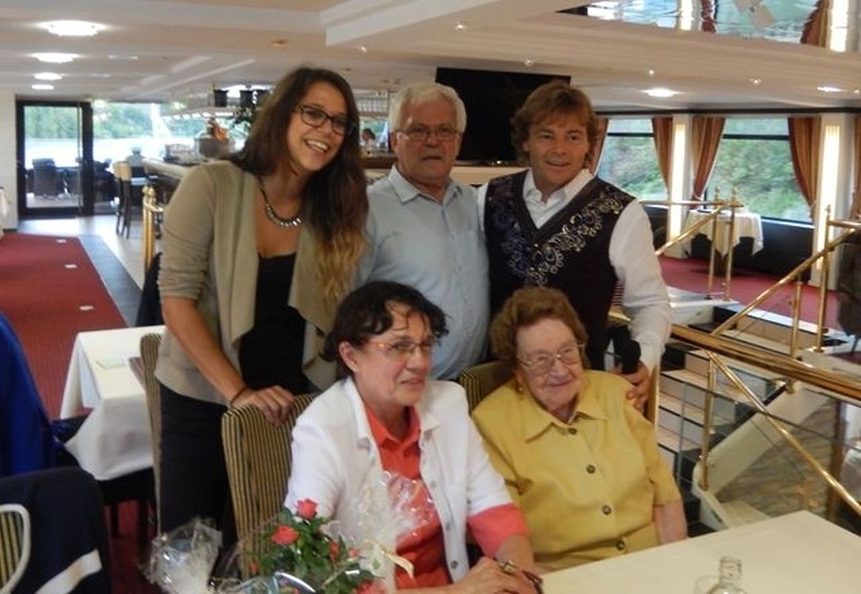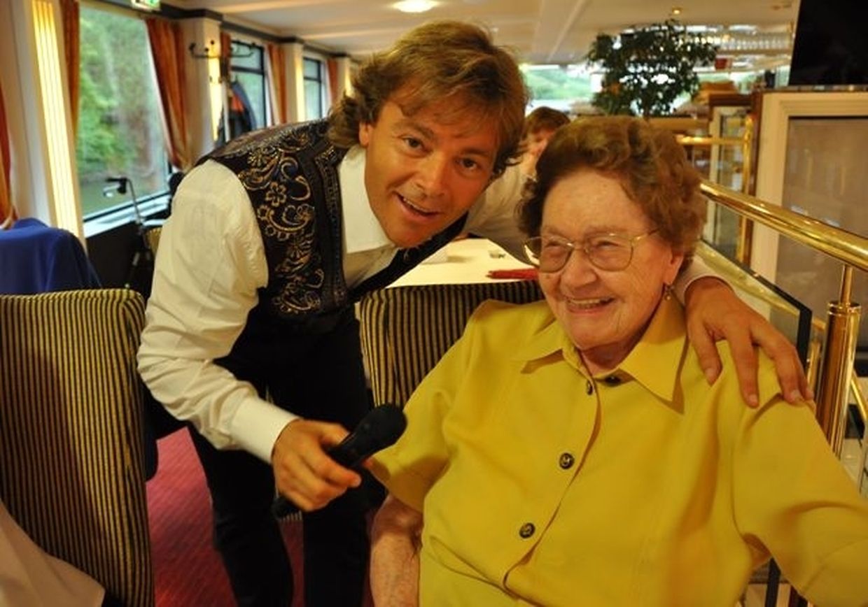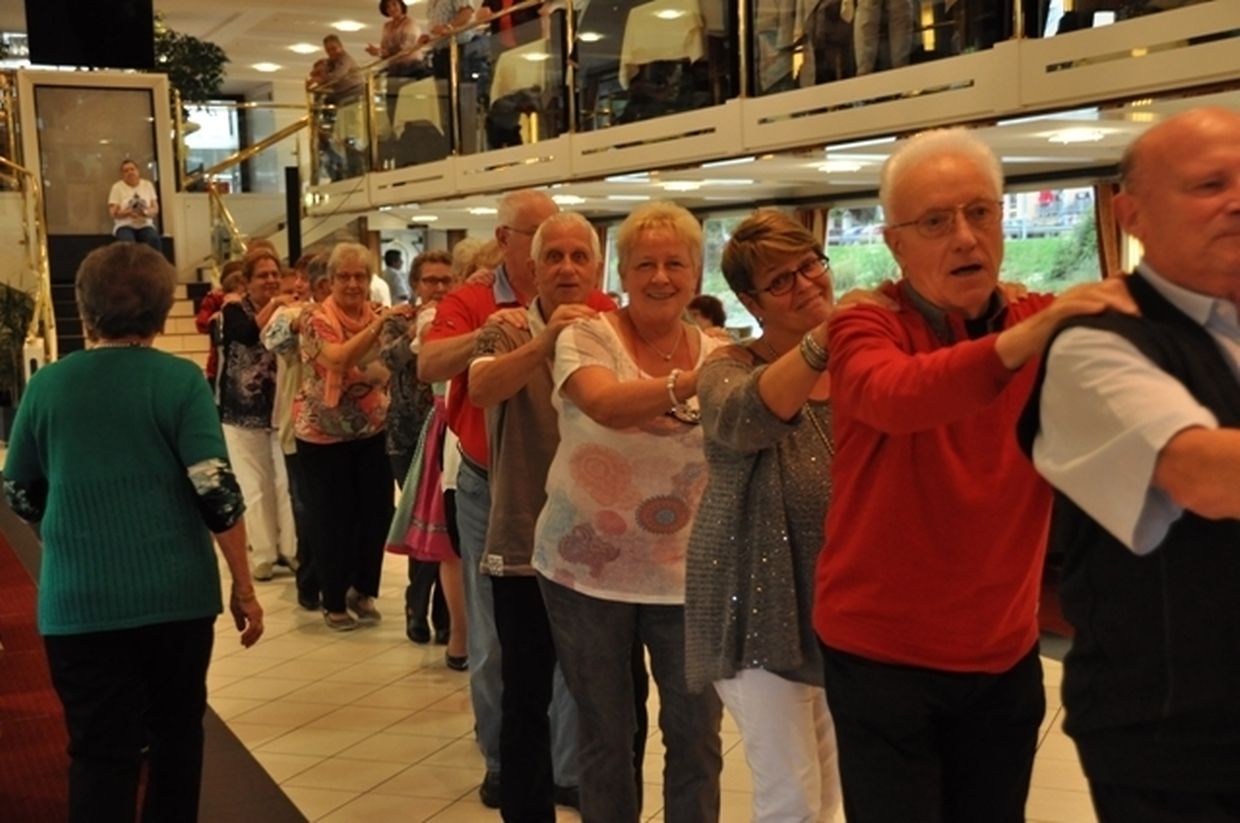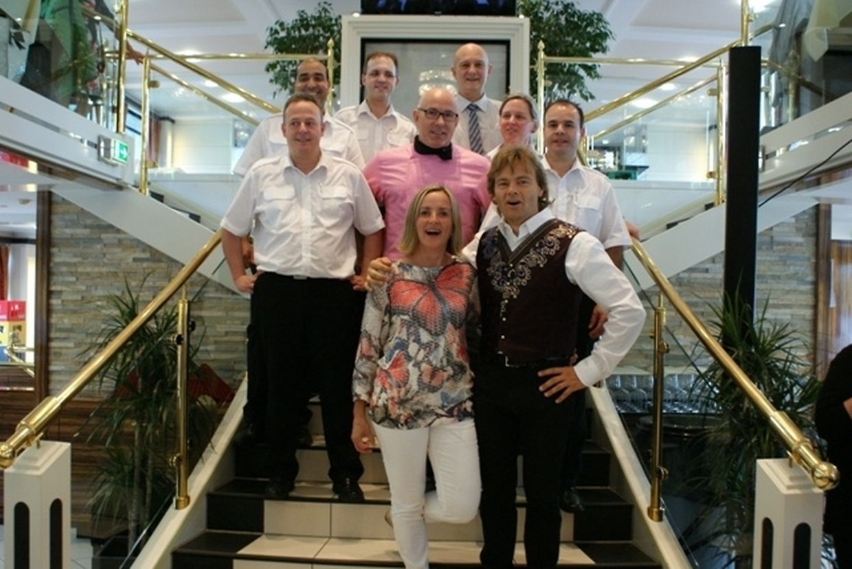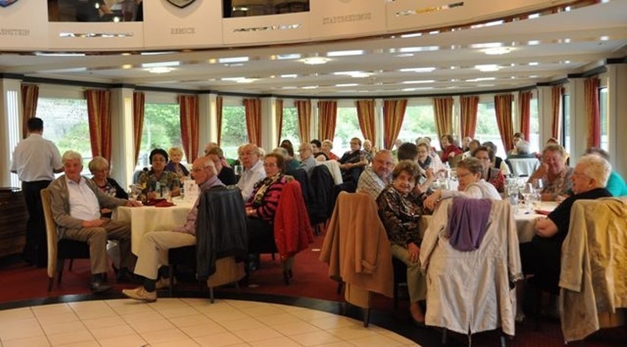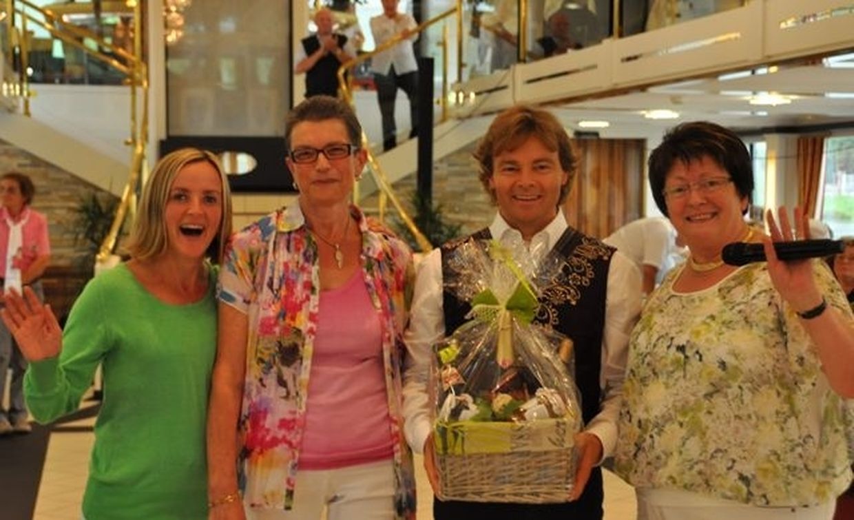 In meiner Eigenschaft als Präsidentin konnte ich an beiden Tagen neben unseren Mitgliedern, welche sich zahlreich eingefunden hatten, auch die Amiperas aus Cruchten und den Sparverein „de leschte Sou“ aus Oberbesslingen und vielen Freunden aus ganz Luxemburg begrüßen. Neben den vielen angereisten Gästen aus allen Teilen Deutschland konnte ich heuer wieder Ute Fritzsch, die zum 2.ten Mal mit Ihrem Fan Club im vollbesetzten Bus aus dem Erzgebirge und mit unzähligen Rosen im Gepäck angereist war um auf unserer Moselrundfahrt mit Rudy Giovannini dabei zu sein. Sebastian Depling, der gehbehinderte junge Mann aus der Leipziger Gegend war mit Familie und Freunden angereist um mit seinem Vorbild Rudy zu singen, denn diese gemeinsame musikalischen Auftritte geben Sebastian Kraft und Lebensmut um mit seinem Schicksalsschlag besser und leichter um zugehen. Viele liebe und treue Freunde waren aus Belgien extra angereist um mit Rudy auf der Mosel zu singen und zu feiern und so herrschte trotz Wind und Regen eitel Sonnenschein und eine supertolle Stimmung während beiden Tagen an Bord der MS „Princesse Marie Astrid“.