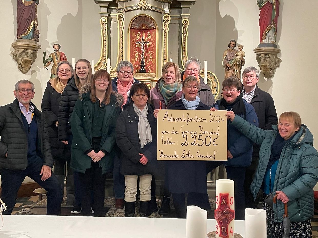 D’Spendekëscht, déi bäi der Aktioun Adventsfënstere mat vu Fënster zu Fënster gereest ass, gouf vu mëtschgiewege Spender nawell gutt gefëllt. Um kierchlech gefeierten Dräikinneksdag ware vill „Fënsterdekorateuren*innen“ an der Präitler Kierch zesummekomm, fir den Erléis vun där Aktioun un d’Amicale Zitha Consdorf asbl ze iwwerreechen. Hir Präsidentin Joëlle Wallenborn huet sech erfreet gewisen iwwer dëse Geste un di rezent gegrënnten Organisatioun.