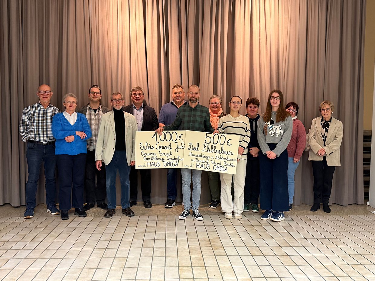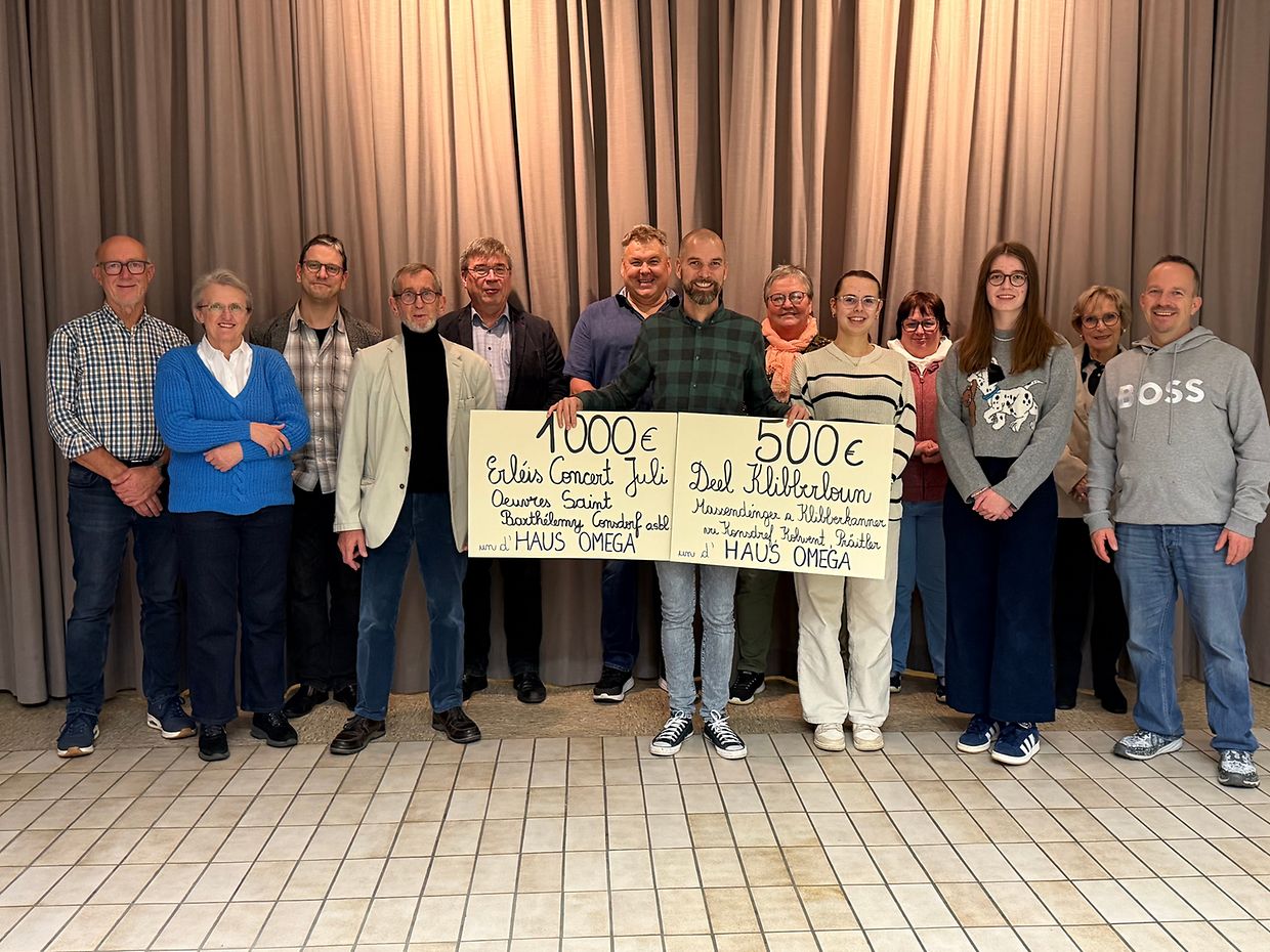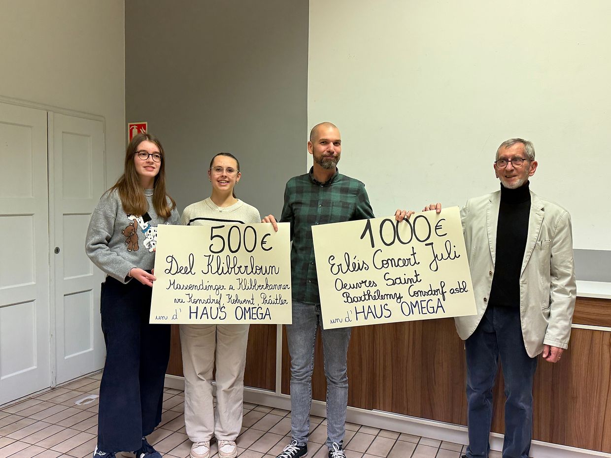 An enger gemittlecher Feierstonn am Festsall um Scheedgen hunn d’Konsdrëffer Massendénger, d’Klibberkanner vu Konsdref, Präitler a Kolwent zesumme mat den Oeuvres St Barthélemy Consdorf zwéi Schecken un d’Haus Omega, vertrueden duerch hire President Fabian Weiser, iwwerreecht.