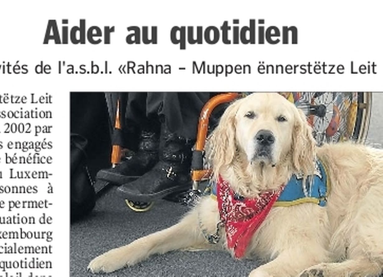 “RAHNA – Muppen ënnerstëtze Leit am Rollstull” est une association sans but lucratif fondée en 2002 par une poignée de bénévoles engagés dans le but d'introduire le bénéfice de chiens d'assistance au Luxembourg au profit de personnes à mobilité réduite et donc de permettre à des personnes en situation de handicap moteur au Luxembourg d'obtenir un tel chien spécialement éduqué pour les aider au quotidien et apporter un rayon de soleil dans leur vie.