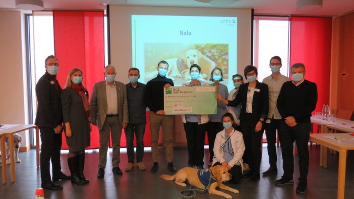 In Präsenz der Direktorin des Hauses, Frau Heike SCHMITT, des Préposé à la Direction, Herr Sandro COLLARINI, des Präsidenten der Assoziation ASA asbl, Herr Dennis NASH, Vertretern von Valorlux, Herr Claude TURPING und von Hein Dechets, Herr Tobias WILHELM und einem Bewohner-Komitee wurde ein Scheck in grandioser Höhe zur Finanzierung eines Assistenzhundes überreicht.