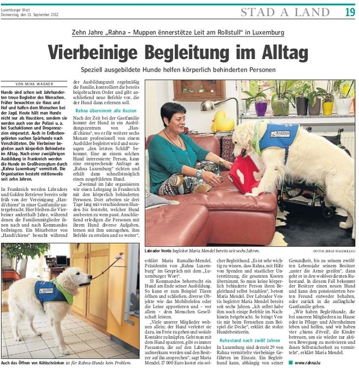Artikel von Mika Wagner im Wort am 13. September 2012 zum Thema "Zehn Jahre "Rahna - Muppen ënnerstëtze Leit am Rollstull" in Luxemburg; Vierbeinige Begleitung im Alltag"
