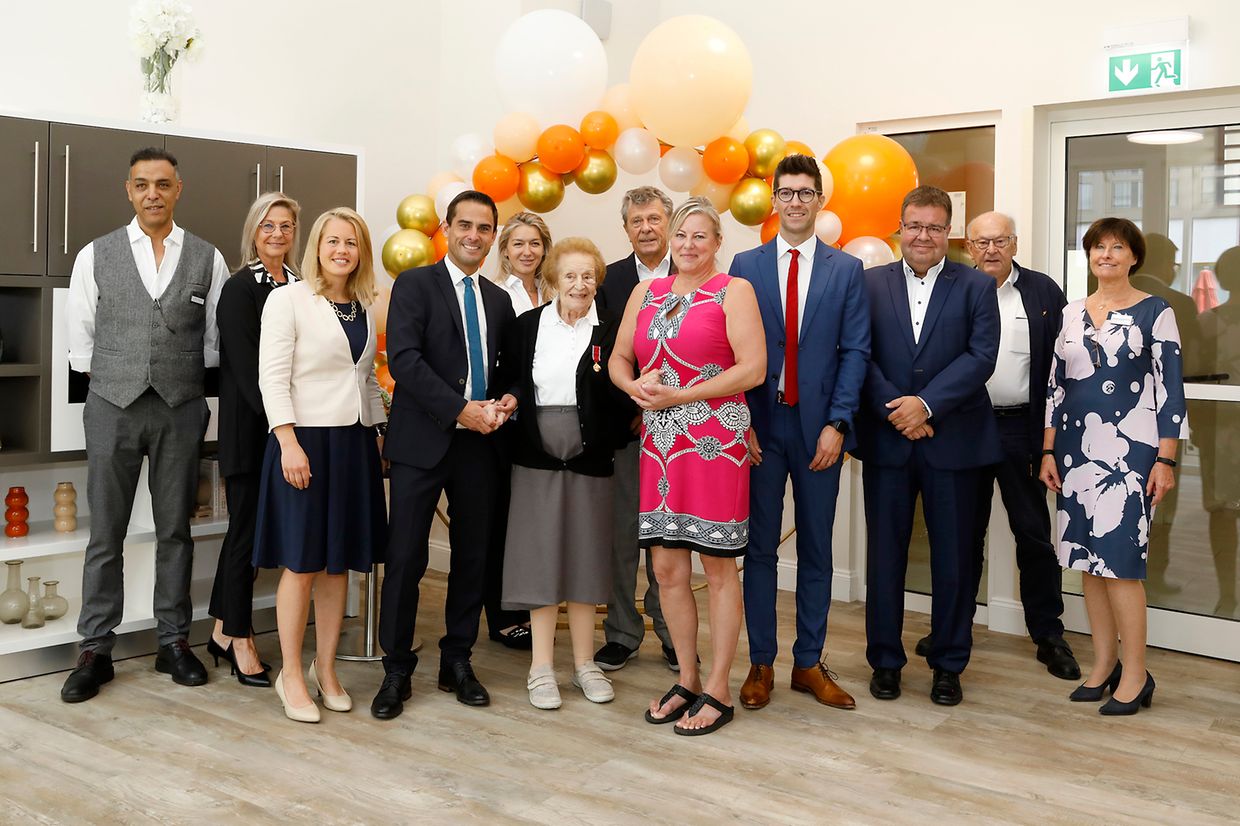 Bildzeile : Frau Élise Lanners-Kremer feierte am 4. August 2023 ihren 100. Geburtstag inmitten ihrer Familie und Bekannten in der Seniorenresidenz Les Jardins d’Alysea. Anwesend waren ebenfalls Herr Max Hahn (4. v. links), Minister für Familie und Integration, und Minister für die Großregion, sowie der Bürgermeister der Gemeinde Erpeldingen an der Sauer, Herr Claude Gleis (3. v. rechts), und die Schöffen der Gemeinde Roeser, Frau Bettina Ballmann (3. v. links) und Herr Angelo Lourenço (4. v. rechts), sowie die Direktion und die BetreuerInnen der Residenz Les Jardins d‘Alysea in Crauthem.