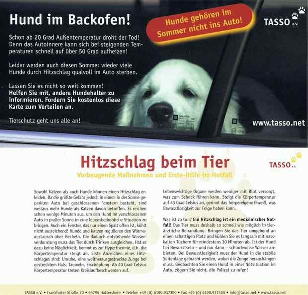 Mit der Kampagne „Hund im Backofen“ kämpfen die Tierschutzorganisation TASSO e.V. und die Online-Community dogspot.de gegen leichtfertige Hundebesitzer. Die Aiderbichlerfrenn Letzebuerg asbl unterstützt diese Aktion.