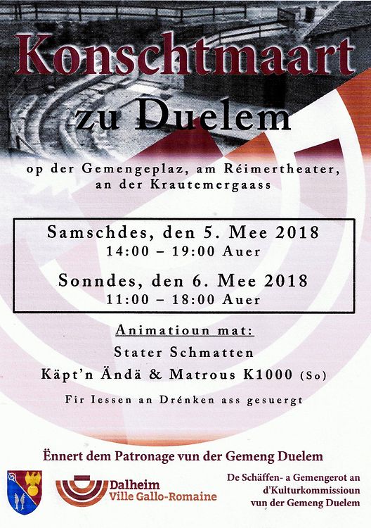 D'Kulturkommissioun ënnert dem Patronage vun der Gemeng Duelem invitéiert op en Konschtmaart an de Stroossen vun Duelem an am Centre Culturel. De 5. Mee geet ëtt lass um 14 Auer an dauert bis 19 Auer. Sonndes kënn der vun 11 Auer un di verschidde Stänn besichen an um 18 Auer ass Schluss. Di 2 Deeg sin d'Stater Schmatten bei hierem Handwierk ze bewonneren a $onndes ab 15 Auer suergt de Käpt`n Ändä a Matrous K1000 fir Stëmmung. Fir Iessen an Drénken ass Beschtens gesuergt.