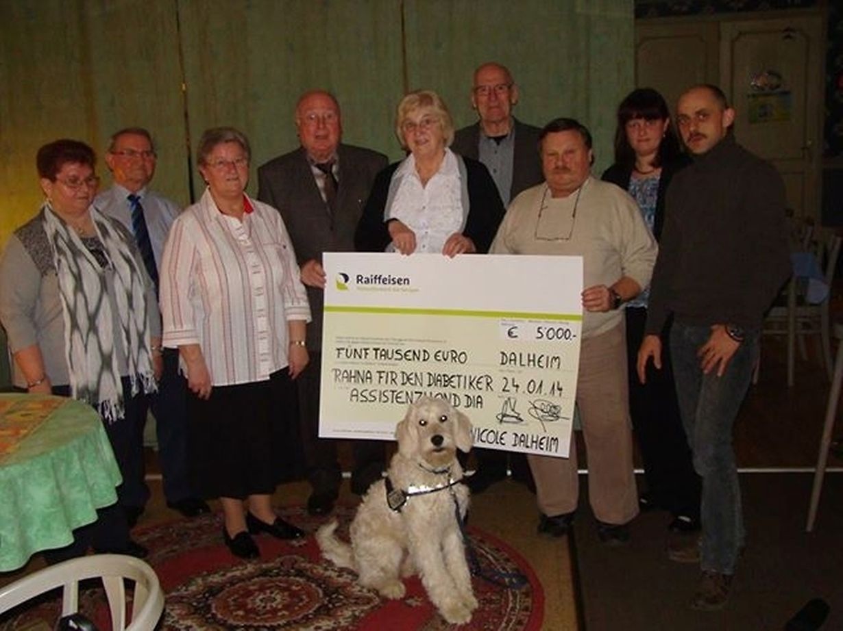 Vor einigen Tagen überreichte der Vorstand des Cercle Avicole Dalheim einen Scheck in Höhe von 5.000 € an die Vereinigung Rahna, um die Finanzierung des ersten Diabetiker-Anfallwarnhundes DIA mit zu unterstützen.